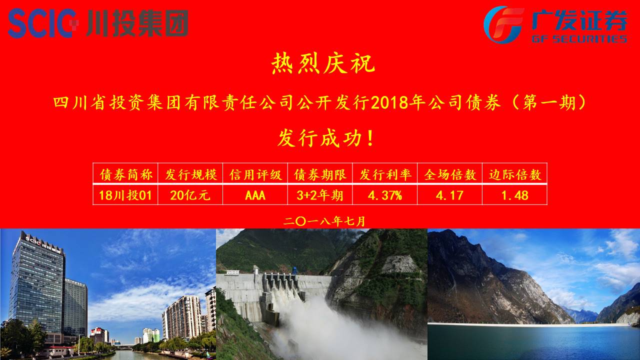 川投集團(tuán)2018年公司債券(第一期)于2018年7月24日成功在上海證券交易所發(fā)行,發(fā)行規(guī)模20億元,債券期限3+2年,發(fā)行利率4.37%,全場認(rèn)購倍數(shù)4.17,發(fā)行利率是截止當(dāng)日2018年公司債券3+2年期全國第二低。本期債券的高質(zhì)量發(fā)行是川投集團(tuán)貫徹落實省委、省政府和省國資委高質(zhì)量發(fā)展要求,在資本市場直接融資的成功實踐。