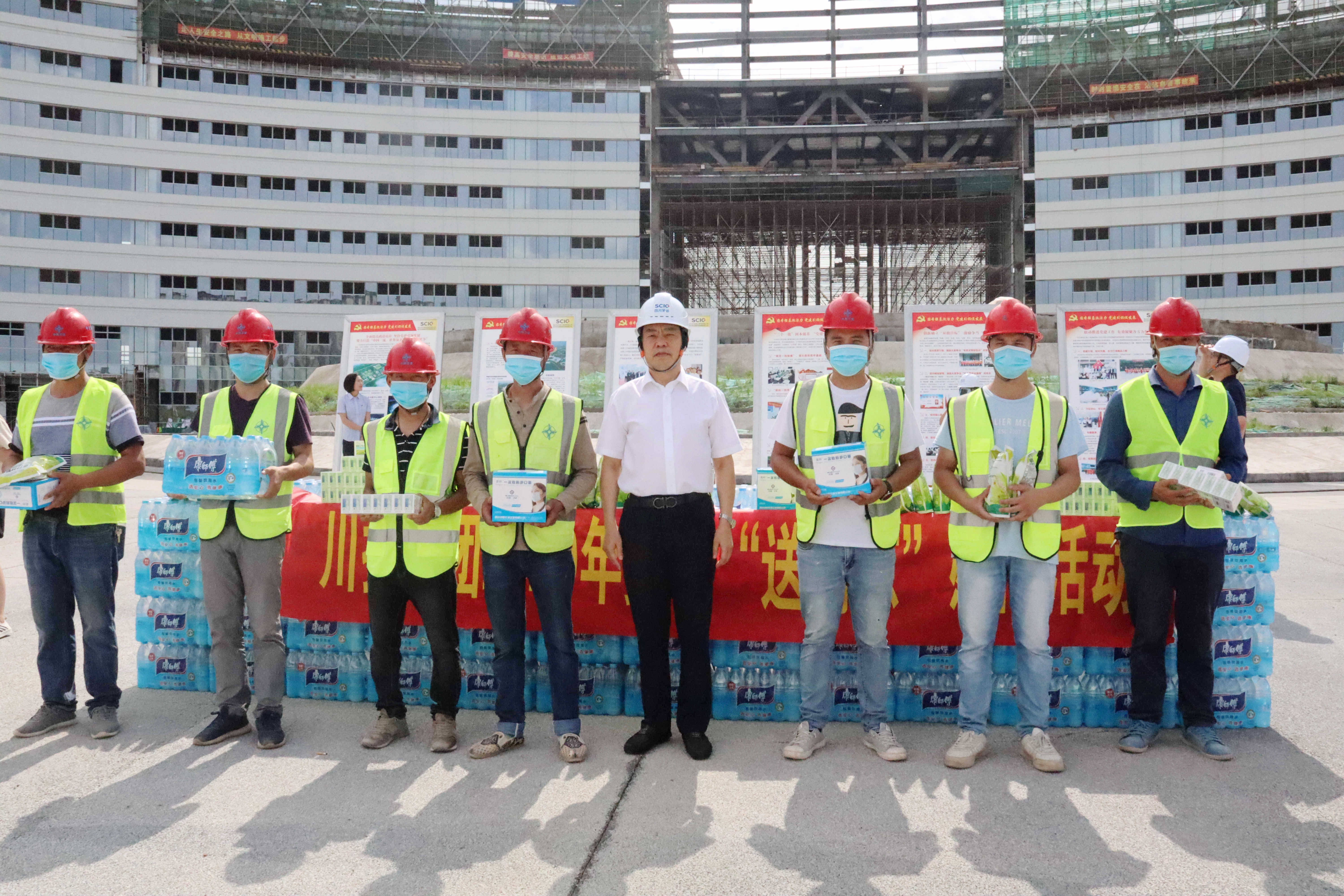 在中國(guó)牙谷科創(chuàng)園施工現(xiàn)場(chǎng)和資陽(yáng)口腔職業(yè)學(xué)院,鄧凱副書記代表集團(tuán)公司對(duì)在高溫下堅(jiān)守一線的施工人員、教職員工和軍訓(xùn)新生代表表示了親切的關(guān)懷和慰問,將消暑物資送到大家手中。