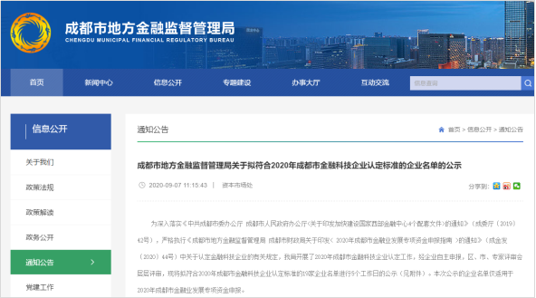 根據(jù)《中共成都市委辦公廳 成都市人民政府辦公廳關(guān)于印發(fā)加快建設(shè)國家西部金融中心 4 個配套文件的通知》 (成委廳〔2019〕42 號)相關(guān)規(guī)定,為支持我市金融科技產(chǎn)業(yè)創(chuàng)新發(fā)展,成都市地方金融監(jiān)督管理局組織開展 2020 年成都市金融科技企業(yè)認定工作。此次評選嚴格列舉2019年度為金融機構(gòu)提供服務收入占當年企業(yè)主營收入比例不低于50%為基礎(chǔ)條件,具有與開展主營業(yè)務相對應的區(qū)塊鏈、物聯(lián)網(wǎng)、人工智能、大數(shù)據(jù)、云計算、生物識別等領(lǐng)域自主知識產(chǎn)權(quán)等多項要求。