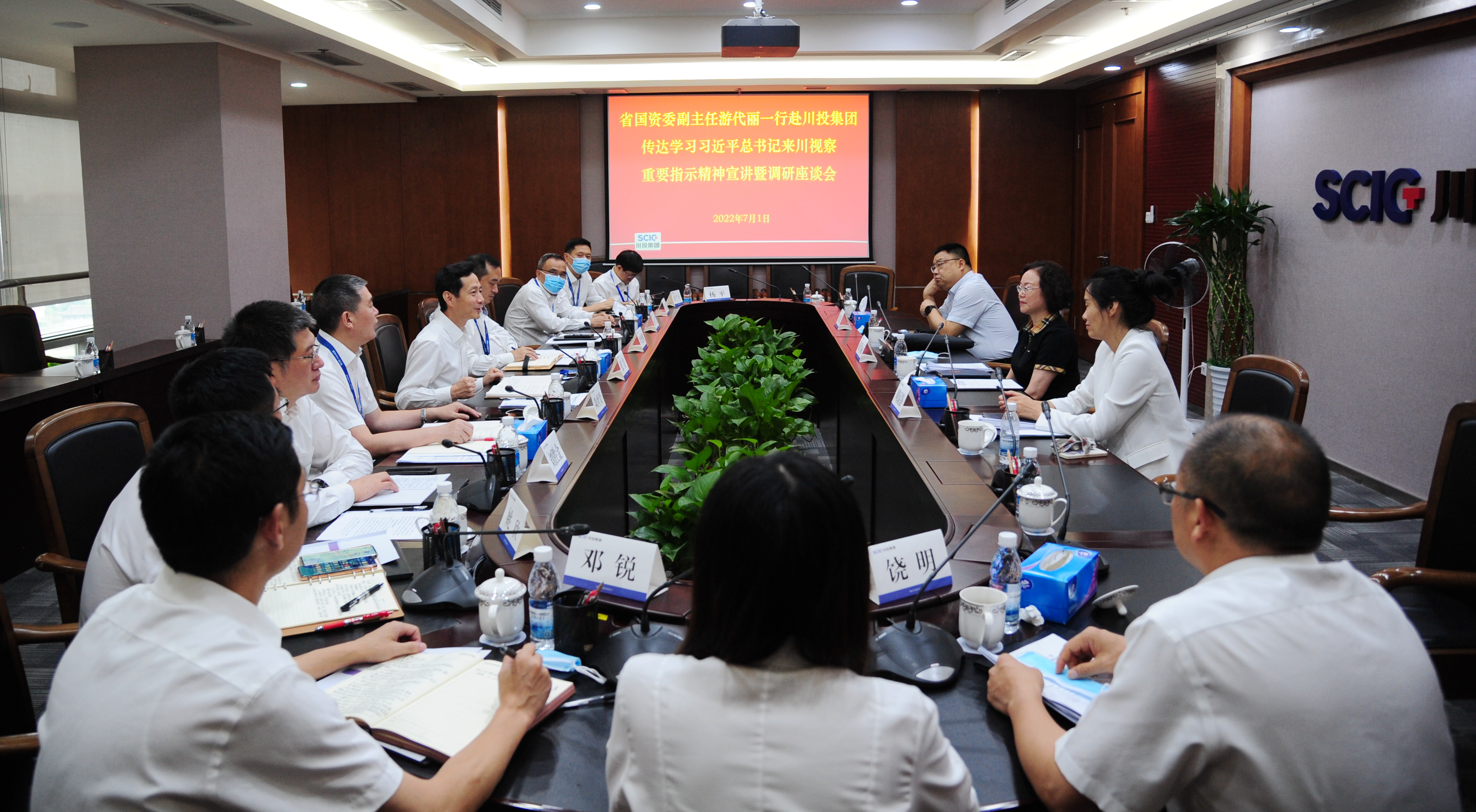 根據(jù)省國資委黨委統(tǒng)一安排部署,7月1日,省國資委黨委委員、副主任游代麗帶隊(duì)到川投集團(tuán)宣講習(xí)近平總書記來川視察重要指示精神,并調(diào)研企業(yè)生產(chǎn)經(jīng)營、電力保供、安全生產(chǎn)、疫情防控等工作情況。集團(tuán)公司副總經(jīng)理張昊參加座談。