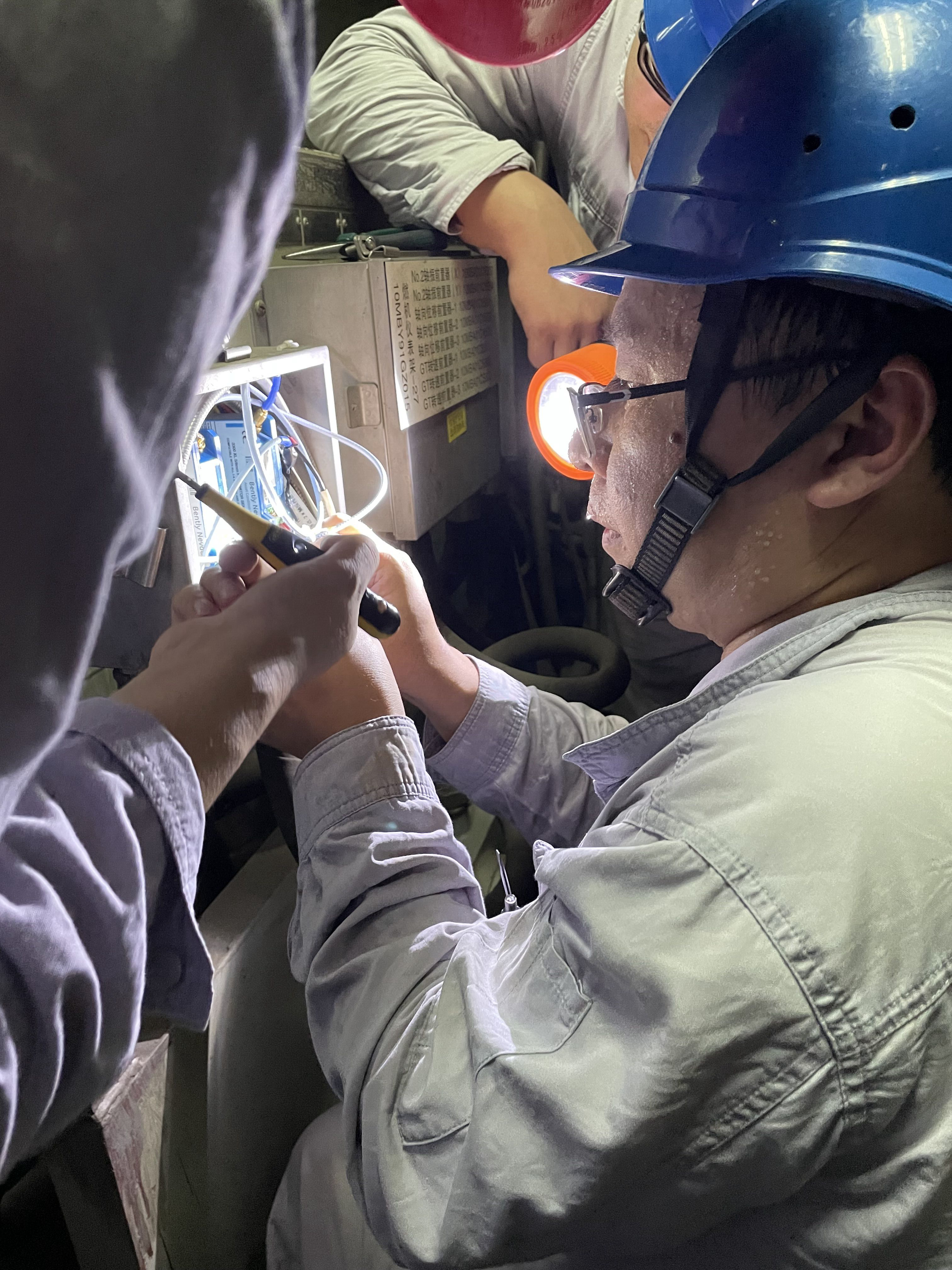 衣服很快就濕透了。在確定了2X方向振動探頭元件正常后,更大的“烤驗”來了——因作業(yè)空間限制,溫度元件的檢查必須趴在燃機(jī)罩殼上進(jìn)行??蓹C(jī)組運(yùn)行時轉(zhuǎn)速高達(dá)3000轉(zhuǎn)每分鐘,高速旋轉(zhuǎn)讓燃機(jī)罩殼溫度高達(dá)70℃。“如果再多趴一會兒,就要烤熟了?!被叵肫甬?dāng)時的情景,祝青海調(diào)侃說。