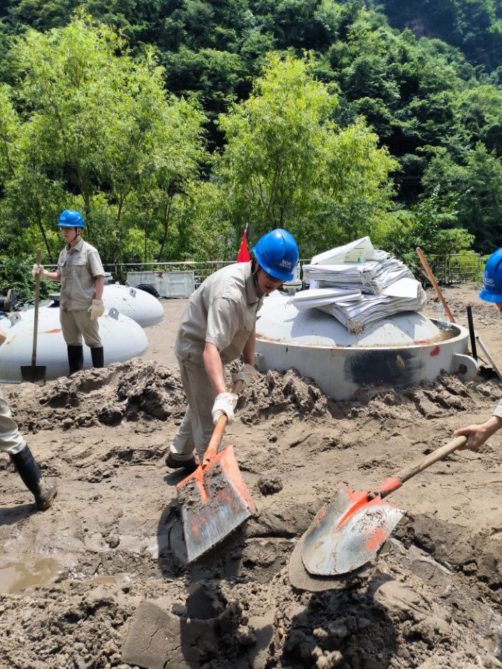 “戰(zhàn)疫保電”的同時(shí),田灣河公司還經(jīng)歷了一次抗險(xiǎn)救災(zāi)考驗(yàn)。8月底,一場大雨裹挾著2萬余方泥石流沖毀了田灣河生產(chǎn)現(xiàn)場通往仁宗海電站的道路與主要線路。為確保安全發(fā)電,基地所有部門悉數(shù)出動(dòng),“白 黑”連續(xù)奮戰(zhàn)搶險(xiǎn)自救。泥濘的滑坡體里,黨員沖鋒在前排查隱患;傾倒的電線桿旁,青年志愿者逐一排查受損情況;被泥水淹沒的庫房里,黨員突擊隊(duì)全力清淤;廠房里、大壩旁,身處交通孤島的黨員職工們沉著冷靜堅(jiān)持工作。