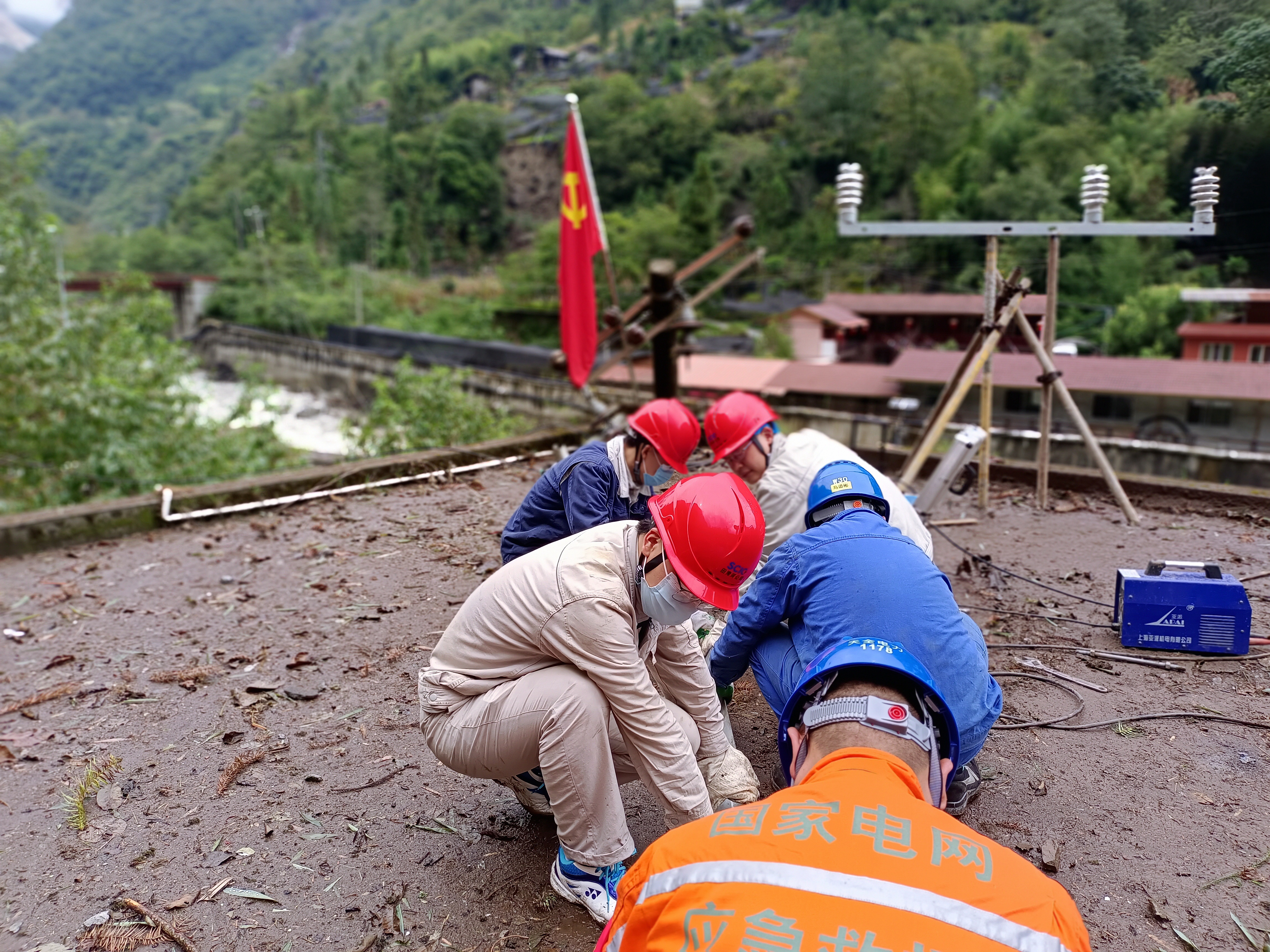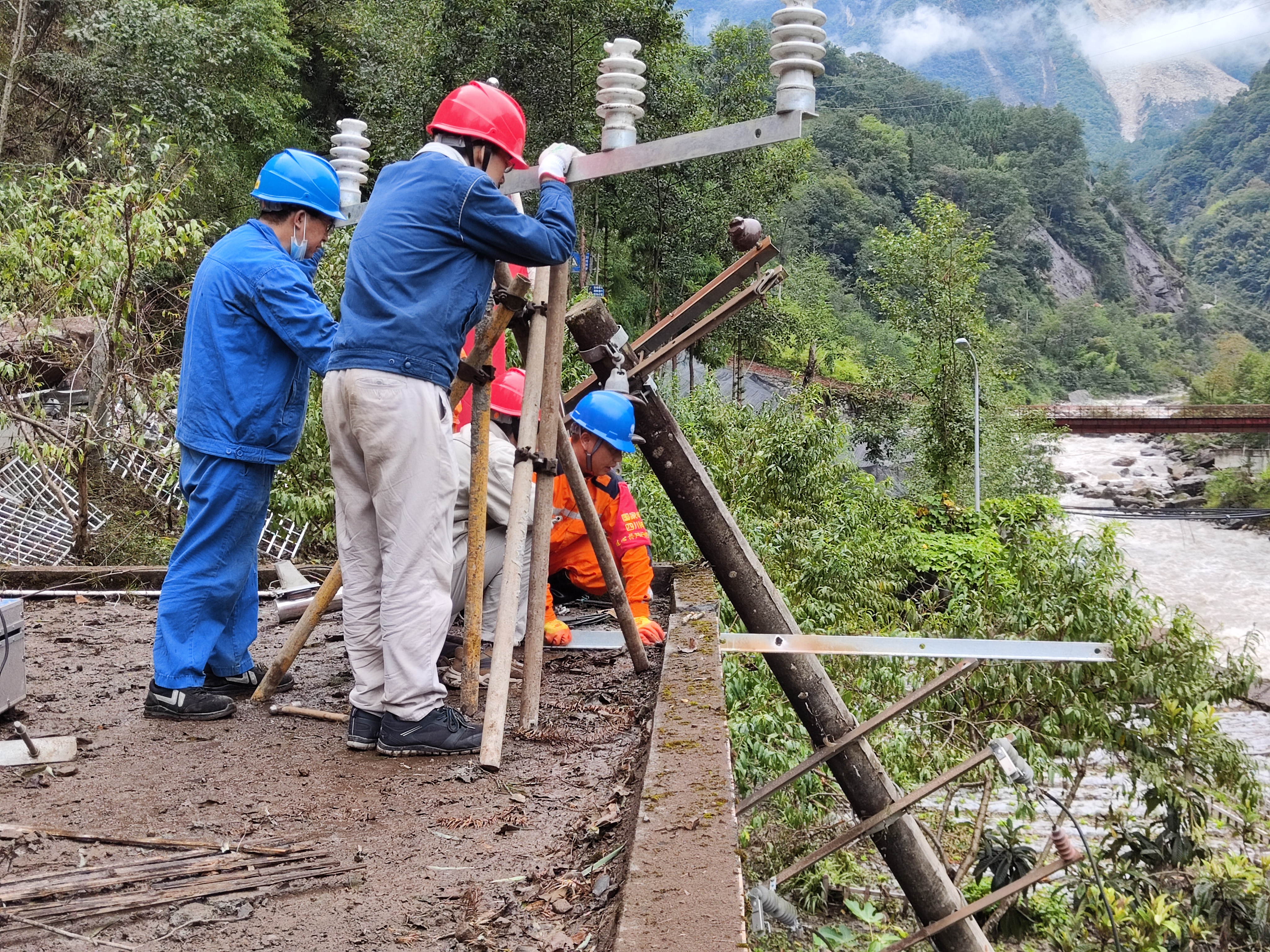 “來雨了,抓緊搶修!”9月9日,地震發(fā)生后的第四天,伴隨著逐漸加大的雨勢,由田灣河公司設備檢修與維護部王志勇等12人組成的營地搶修小分隊,聯(lián)合國網四川雅安電力(集團)股份有限公司抗震救災臨時黨支部組成供電搶修攻堅隊伍,正在全力開展草科生活營地配電房10kV地方電力接入搶修工作。