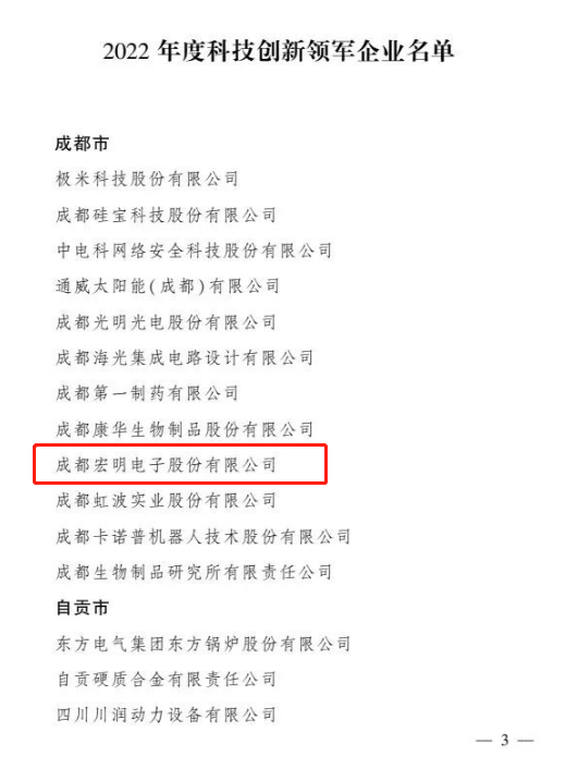 9月21日,為進(jìn)一步推動(dòng)全省各類創(chuàng)新型企業(yè)蓬勃發(fā)展、競(jìng)相成長(zhǎng),四川省人民政府對(duì)在2022年度科技創(chuàng)新工作中表現(xiàn)突出的50家企業(yè)予以通報(bào)表?yè)P(yáng),川投信產(chǎn)所屬宏明電子榮獲“科技創(chuàng)新領(lǐng)軍企業(yè)”稱號(hào)。