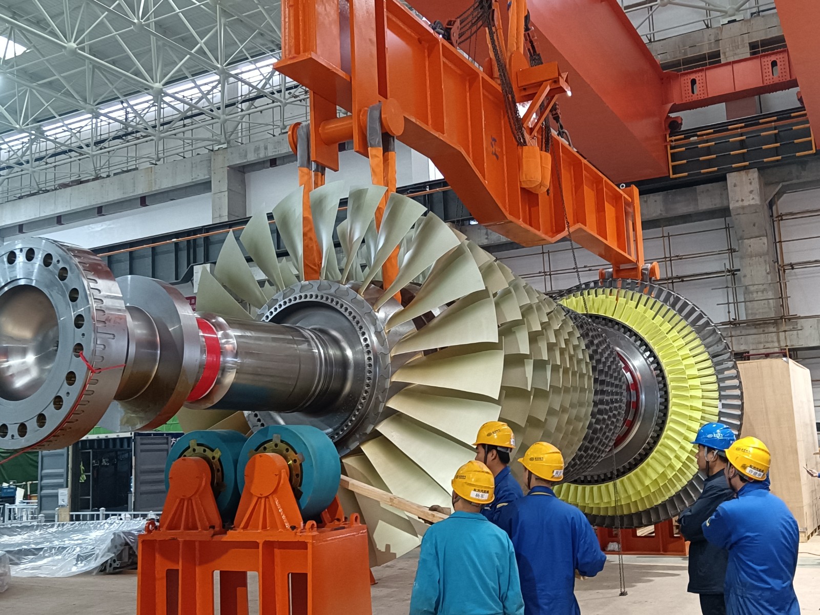 也是在12月7日,主廠房施工現(xiàn)場隨著現(xiàn)場指揮“吊裝開始”一聲令下,主廠房行車裝載著#2汽輪機(jī)臺板向預(yù)定位置緩緩移動,各崗位人員迅速行動,#2機(jī)組汽輪機(jī)臺板安裝工作正式開始,現(xiàn)場一片忙碌。