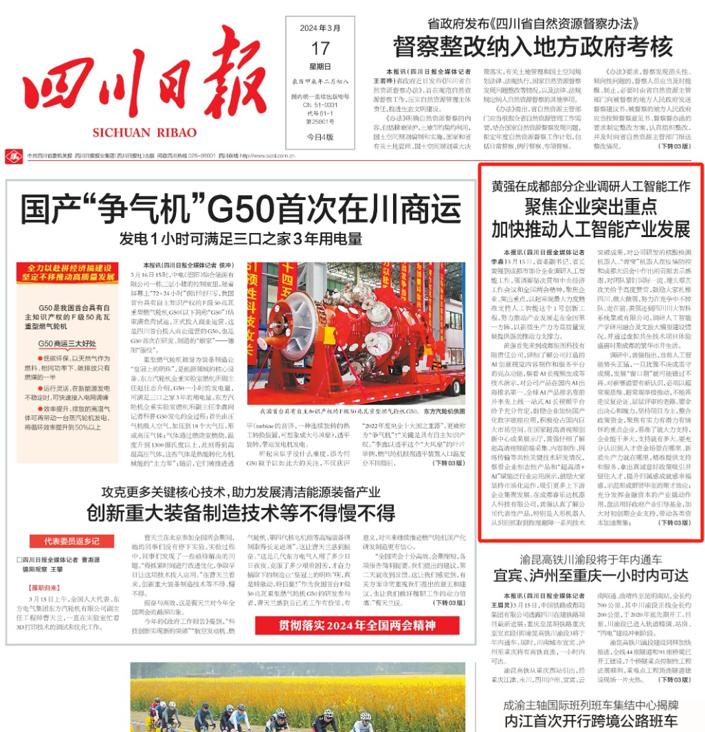 3月15日,省委副書記、省長黃強到成都市部分企業(yè)調(diào)研人工智能工作,強調(diào)要堅決貫徹中央經(jīng)濟工作會議和全國兩會精神,聚焦企業(yè)、突出重點,以超常規(guī)最大力度精準(zhǔn)支持人工智能這個1號創(chuàng)新工程,努力推動產(chǎn)業(yè)發(fā)展走在全國第一方陣,以新質(zhì)生產(chǎn)力為高質(zhì)量發(fā)展提供強勁推動力支撐力。