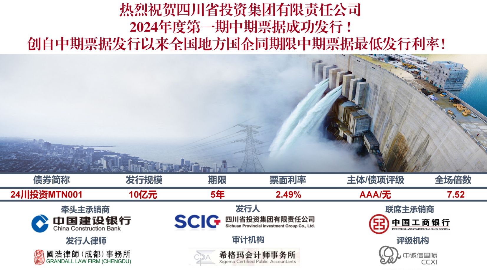 4月18日,川投集團(tuán)成功發(fā)行2024年度第一期中期票據(jù),創(chuàng)下自中期票據(jù)發(fā)行以來(lái)四川省同期限中期票據(jù)最低發(fā)行利率和全國(guó)地方國(guó)企同期限中期票據(jù)的最低發(fā)行利率記錄。
