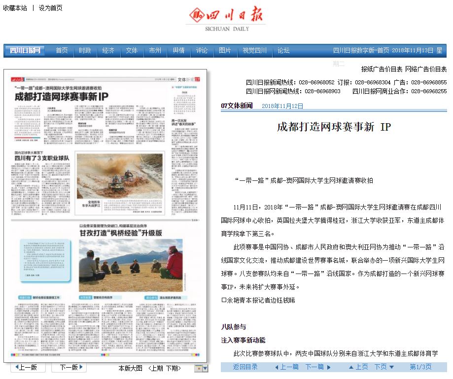 此項賽事是中國網(wǎng)協(xié)、成都市人民政府和澳大利亞網(wǎng)協(xié)為推動“一帶一路”沿線國家文化交流,推動成都建設世界賽事名城,聯(lián)合舉辦的一項新興國際大學生網(wǎng)球賽。八支參賽隊均來自“一帶一路”沿線國家。作為成都打造的一個新興網(wǎng)球賽事IP,未來將擴大賽事外延。