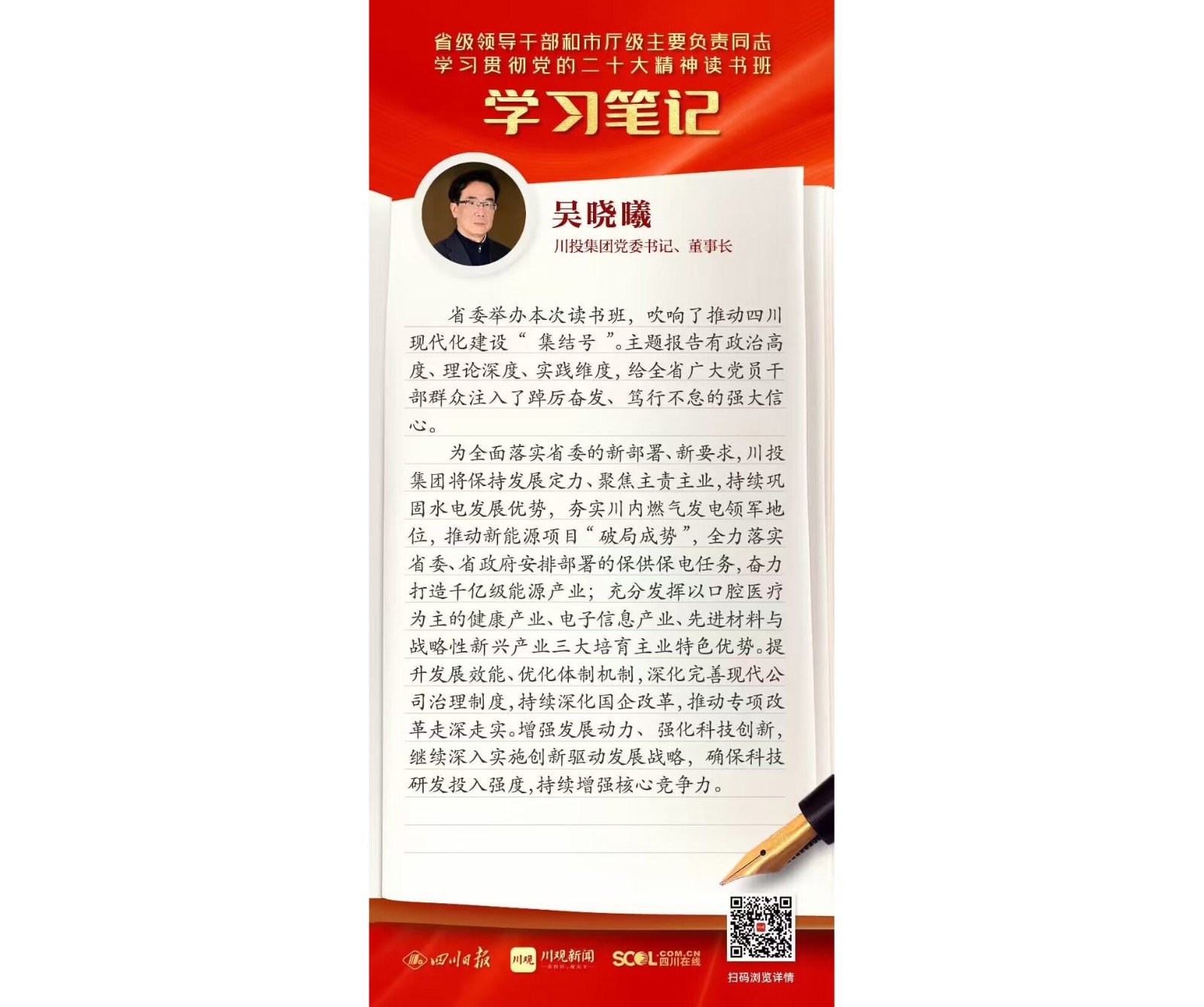 為全面落實省委的新部署、新要求,川投集團將保持發(fā)展定力、聚焦主責主業(yè),持續(xù)鞏固水電發(fā)展優(yōu)勢,夯實川內燃氣發(fā)電領軍地位,推動新能源項目“破局成勢”,全力落實省委、省政府安排部署的保供保電任務,奮力打造千億級能源產業(yè);充分發(fā)揮以口腔醫(yī)療為主的健康產業(yè)、電子信息產業(yè)、先進材料與戰(zhàn)略性新興產業(yè)三大培育主業(yè)特色優(yōu)勢。提升發(fā)展效能、優(yōu)化體制機制,深化完善現(xiàn)代公司治理制度,持續(xù)深化國企改革,推動專項改革走深走實。增強發(fā)展動力、強化科技創(chuàng)新,繼續(xù)深入實施創(chuàng)新驅動發(fā)展戰(zhàn)略,確??萍佳邪l(fā)投入強度,持續(xù)增強核心競爭力。