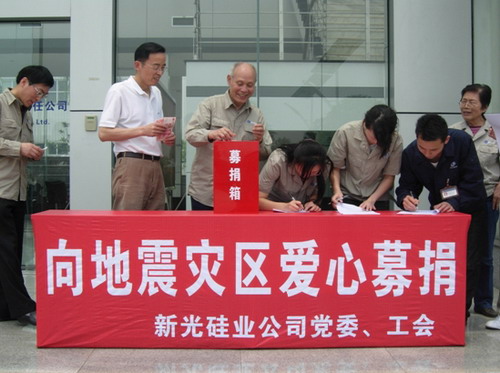 募捐箱前,愛潮涌動(dòng)。公司黨員、干部、員工紛紛向?yàn)?zāi)區(qū)群眾伸出我們新光人的雙手,獻(xiàn)出我們新光人的愛心,天真活潑的員工子女也托父親帶來了自己的愛心,不少在外地出差的員工還打來委托電話,人們含著無比激動(dòng)的心情踴躍捐款,奉獻(xiàn)愛心。公司員工包括正式員工、老專家、外聘人員、協(xié)議用工人員、員工子女、寧夏陽(yáng)光硅業(yè)有限責(zé)任公司在新光硅業(yè)公司培訓(xùn)人員共計(jì)353人,為地震災(zāi)區(qū)人民捐款61948.00元。20日又發(fā)出了“我們都是新光人,我們都是一家人”向員工受災(zāi)家庭捐款的倡議,共計(jì)245名員工,為受災(zāi)公司員工家庭捐款23970.00元。同時(shí),公司也對(duì)地震災(zāi)區(qū)捐款200萬元,對(duì)5個(gè)兄弟企業(yè)進(jìn)行了資金援助100萬元。