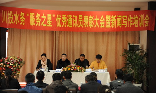 3月15日下午,川投水務(wù)2011年度“服務(wù)之星”、優(yōu)秀通訊員表彰大會(huì)暨新聞寫作培訓(xùn)會(huì)在邛崍平樂古鎮(zhèn)濯纓水閣酒店舉行,川投水務(wù)總經(jīng)理梁有國出席會(huì)議,綜合部經(jīng)理何曉蘇主持會(huì)議,來自川投水務(wù)所屬公司部分班子成員、綜合部經(jīng)理、“服務(wù)之星”、通訊員代表,以及川投水務(wù)本部通訊員和相關(guān)人員共四十余人參加了會(huì)議。