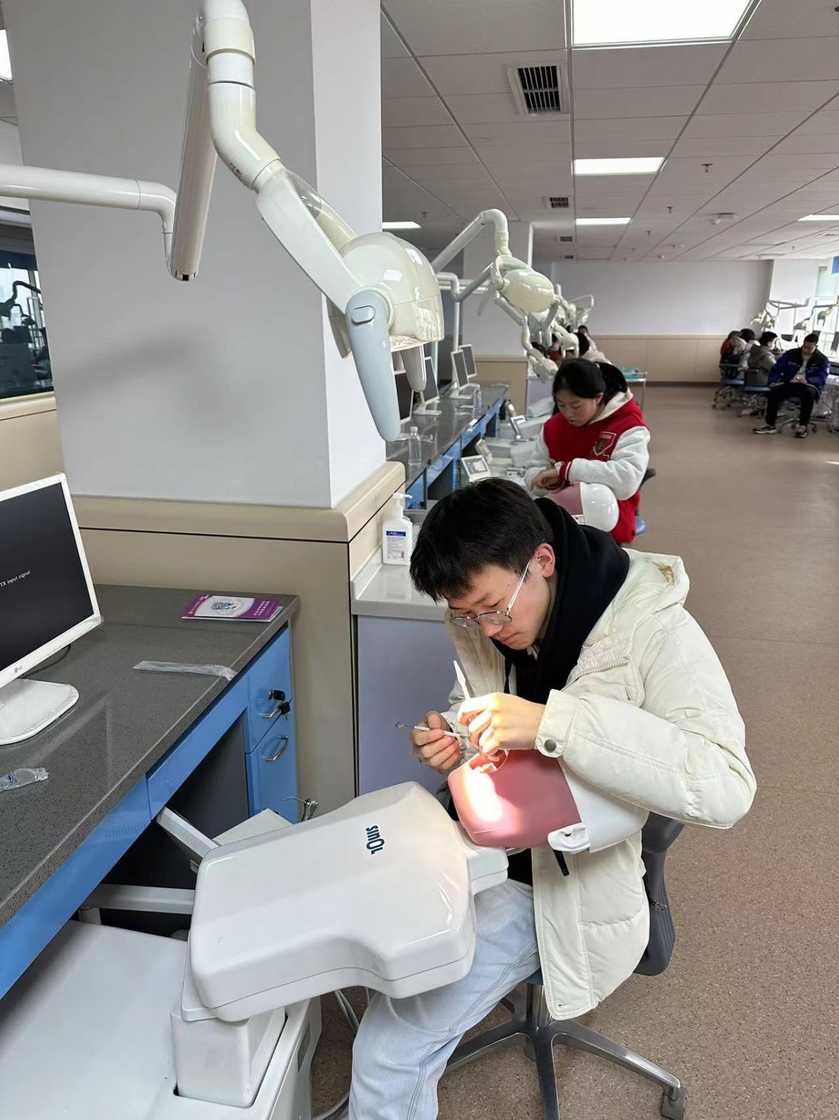 在實踐操作環(huán)節(jié),同學們在醫(yī)院仿頭模室體驗了“牙醫(yī)的一天”,通過實踐操作,更加深入地了解了口腔醫(yī)生這個職業(yè),對口腔醫(yī)學的前沿發(fā)展和最新的教育教學手段都有了全新的認識。