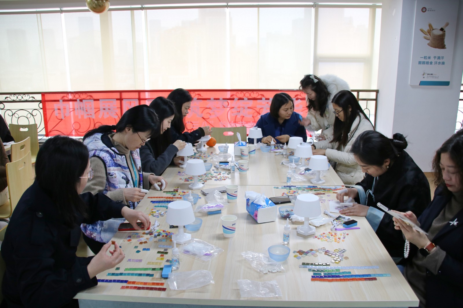 活動(dòng)中,女職工們首先了解了馬賽克藝術(shù)的起源、發(fā)展和應(yīng)用,隨后沉浸在手工創(chuàng)作的樂趣中,充分發(fā)揮想象和創(chuàng)意,將不同顏色、不用形狀的玻璃片拼合組成繽紛多彩的圖案,制作出屬于自己的獨(dú)一無二的馬賽克燈。