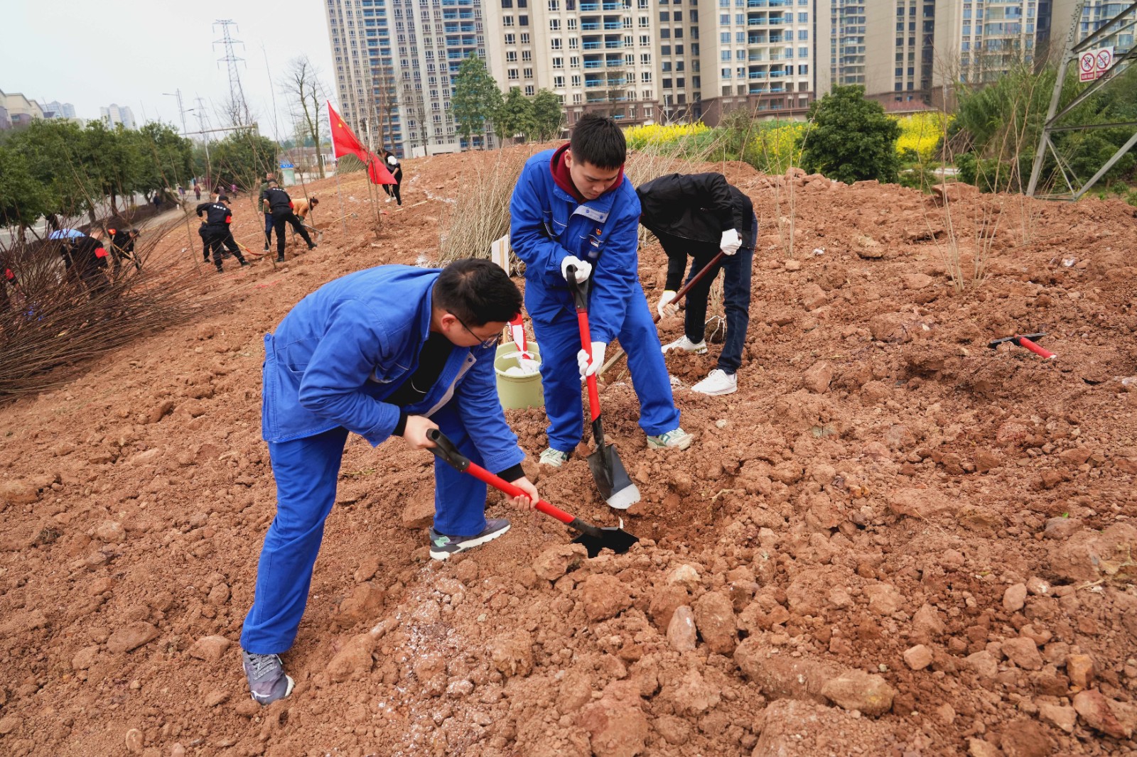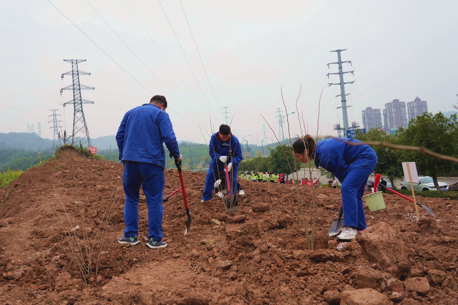 活動現(xiàn)場,志愿者們揮鍬鏟土、扶苗植樹、提水澆灌,大家密切配合、干勁十足,在春日的陽光下盡情揮灑汗水,現(xiàn)場一派熱火朝天的景象。經(jīng)過大家的辛勤勞動,一棵棵樹苗被栽下,一片片土地?zé)òl(fā)新顏,大地上又增添了一抹新綠,孕育著勃勃生機。