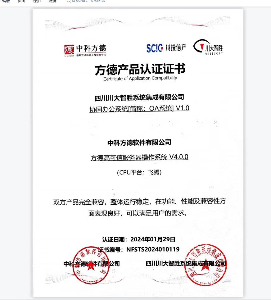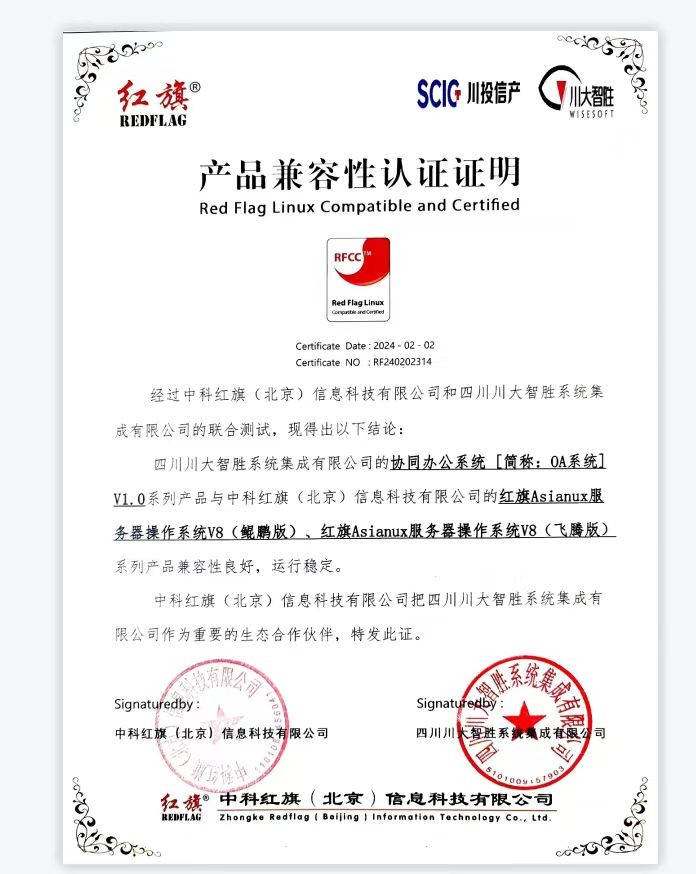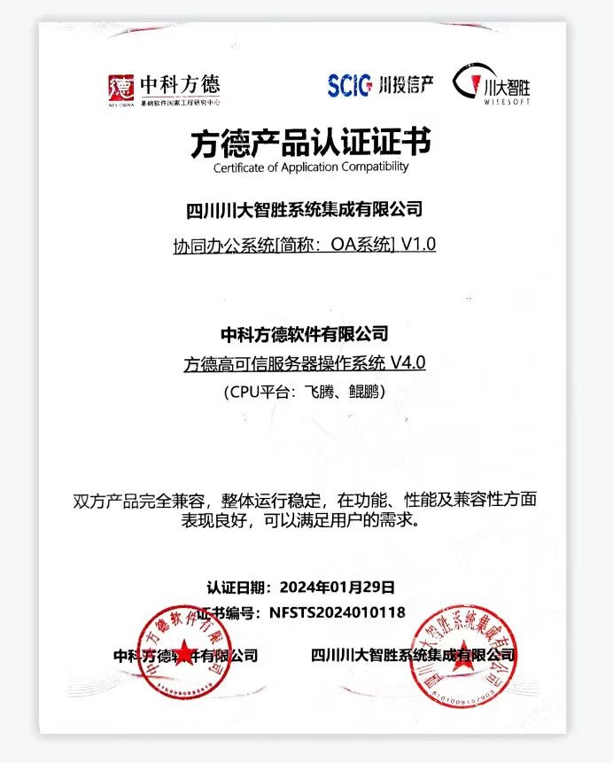 今年以來,為積極響應(yīng)市場(chǎng)需求,智勝集成以信創(chuàng)應(yīng)用軟件為突破口,開展了一系列技術(shù)創(chuàng)新和信創(chuàng)革新。在生態(tài)整合方面,公司攜手中科方德、中科紅旗等國(guó)內(nèi)主流信創(chuàng)平臺(tái),進(jìn)行了多層次的產(chǎn)品兼容測(cè)試認(rèn)證工作。其中,公司協(xié)同辦公系統(tǒng) V1.0產(chǎn)品與中科方德的方德高可信服務(wù)器操作系統(tǒng) V4.0和方德高可信服務(wù)器操作系統(tǒng) V4.0.0產(chǎn)品進(jìn)行了產(chǎn)品兼容性認(rèn)證,獲兩項(xiàng)信創(chuàng)認(rèn)證。