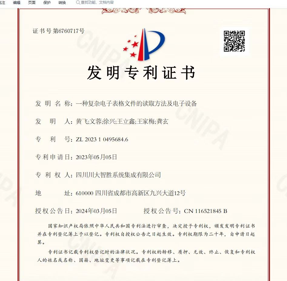 除了信創(chuàng)認(rèn)證方面的突破,智勝集成在發(fā)明專利方面也取得了顯著進(jìn)展。由公司申報(bào)的發(fā)明專利《一種針對(duì)復(fù)雜電子表格文件的高效讀取方法及相應(yīng)的電子設(shè)備》獲得授權(quán),該發(fā)明專利將助力企業(yè)優(yōu)化應(yīng)用軟件,有力提升企業(yè)在處理和導(dǎo)入電子表格數(shù)據(jù)時(shí)的性能與效率。