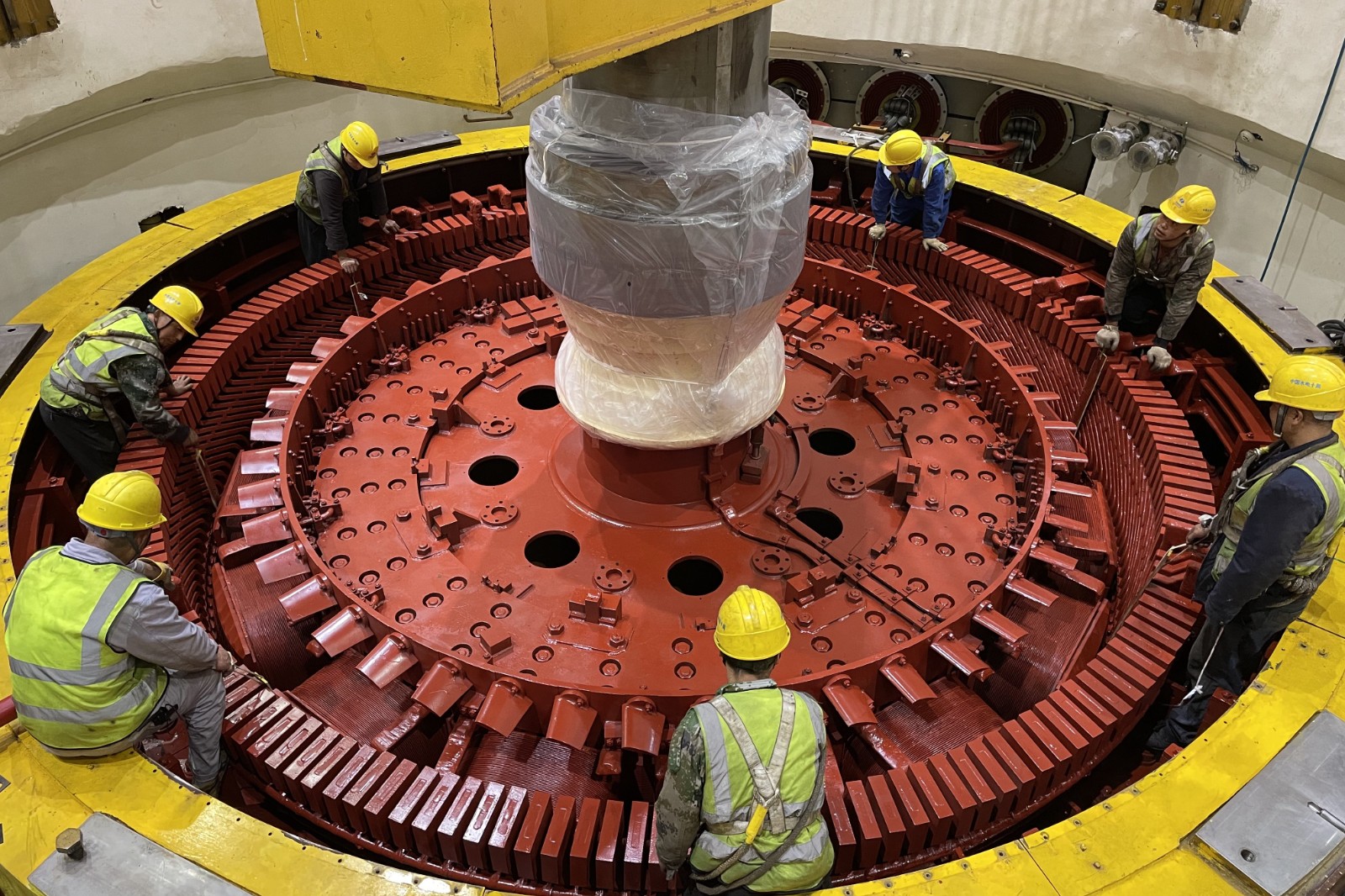 作為水輪發(fā)電機組的核心部件之一,轉(zhuǎn)子回裝質(zhì)量的好壞,直接影響到發(fā)電機組整體檢修質(zhì)量。為確保這個重約260噸的“巨無霸”安全回裝,檢修監(jiān)理組事先組織技術(shù)人員,與大修單位一起對橋機起重系統(tǒng)、電源和控制系統(tǒng)進行全面仔細檢查,確保設(shè)備穩(wěn)定可靠。下午14時許,經(jīng)“三起三落”的試探性起吊,發(fā)電機轉(zhuǎn)子在橋機的牽引下,從安裝間支架上慢慢升起,緩緩向機坑靠近。經(jīng)過近一小時的奮戰(zhàn),轉(zhuǎn)子安全吊入機坑,穩(wěn)穩(wěn)地座落到發(fā)電機機架上。
