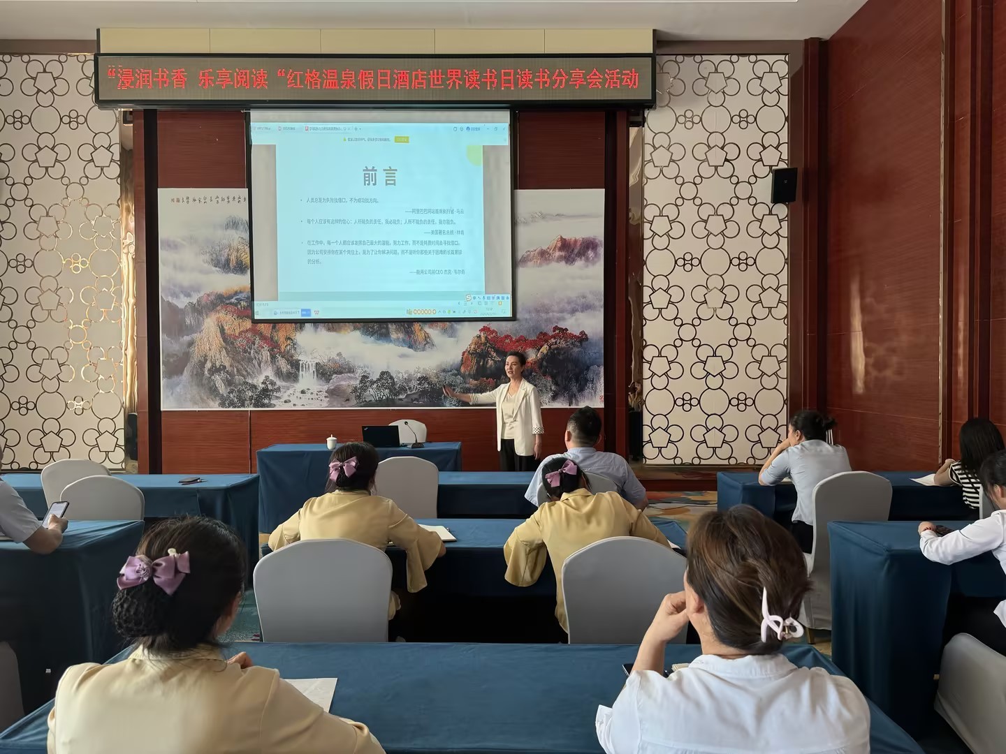 活動邀請酒店負(fù)責(zé)人范英為大家作讀書分享,她圍繞《執(zhí)行力》一書,結(jié)合酒店目前經(jīng)營情況為大家詳細(xì)闡述“執(zhí)行力”對于團(tuán)隊合力的重要性以及關(guān)鍵性,引導(dǎo)大家提高執(zhí)行力,將書中所學(xué)有效運用到工作中、生活中。她鼓勵大家多讀書、讀好書,通過讀書豐富學(xué)識、提升能力,推動企業(yè)整體素質(zhì)提升。