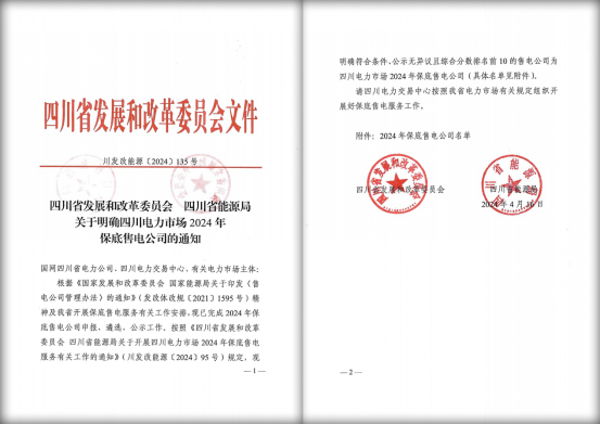 近日,省發(fā)改委、省能源局發(fā)布了《關(guān)于明確2024年保底售電公司的通知》,川投售電再次被評(píng)選為四川電力市場(chǎng)2024年保底售電公司。川投售電連續(xù)兩年獲此殊榮,是電力主管部門(mén)及各市場(chǎng)主體對(duì)川投售電經(jīng)營(yíng)能力、市場(chǎng)信譽(yù)、員工實(shí)力等各方面的認(rèn)可,更是川投售電全體干部職工腳踏實(shí)地、眾志成城、全力以赴提升公司綜合實(shí)力的具體體現(xiàn)。