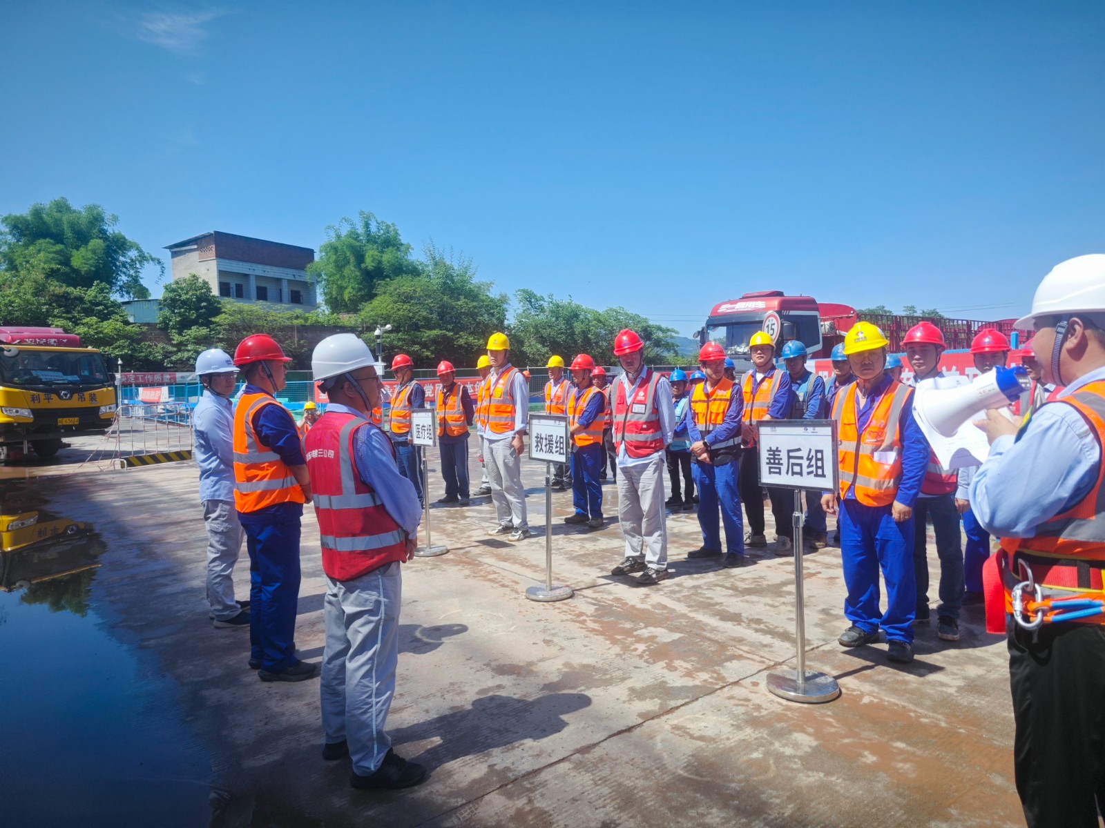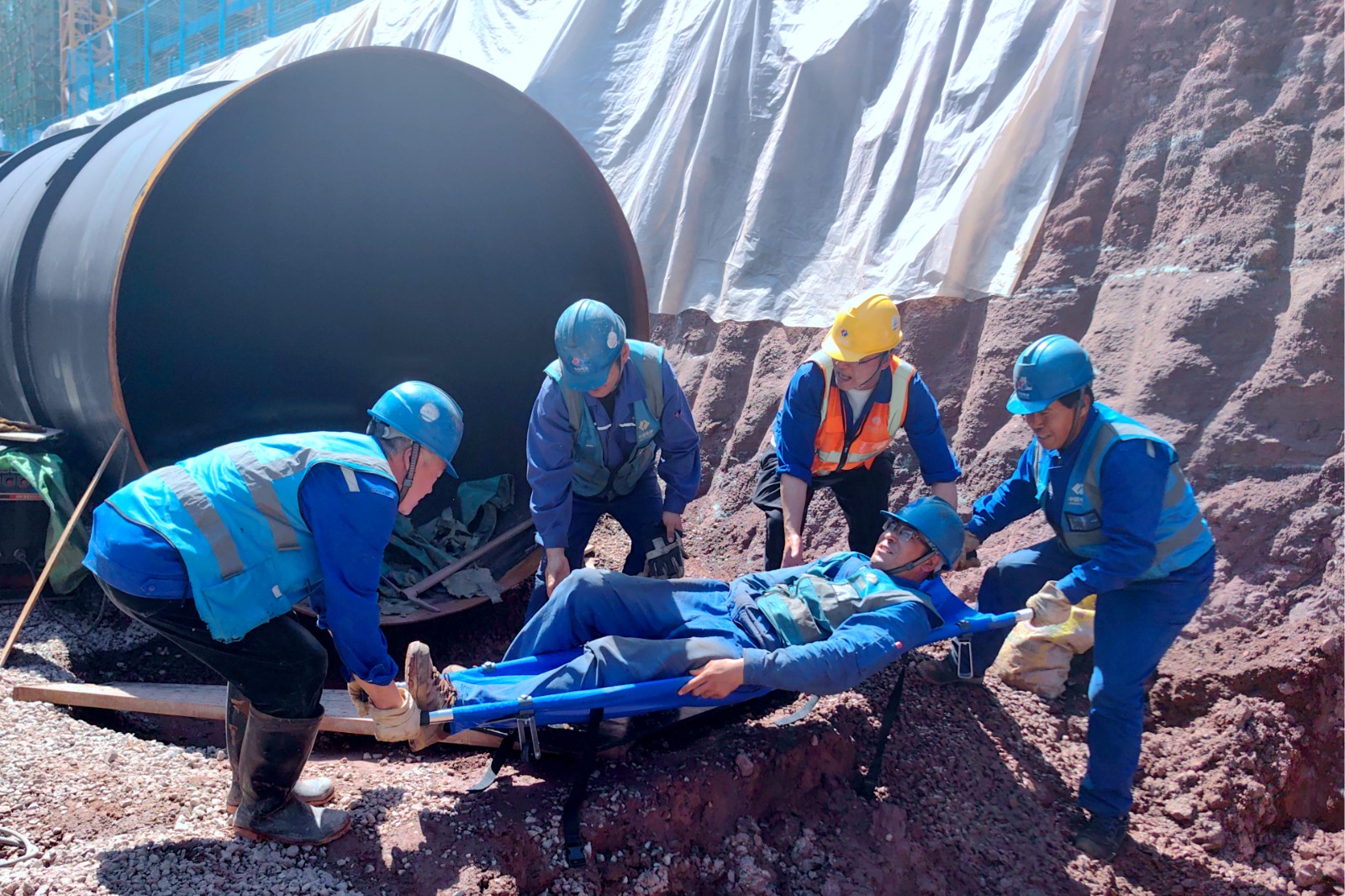 本次演練分為醫(yī)療、救援、后勤、善后4個小組,采用實戰(zhàn)形式進行演練。演練模擬場景為:5月13日下午,施工現(xiàn)場驟降暴雨造成循環(huán)水泵房北側(cè)的循環(huán)水管道基槽邊坡發(fā)生局部塌方,塌方導致基坑下方一名作業(yè)人員和工器具被掩埋,循環(huán)水泵房基坑內(nèi)流入大量積水,如不及時進行抽排可能導致基坑邊坡浸泡發(fā)生大面積坍塌事故,需立即組織人員搶險。接到險情報警后,防汛應急指揮部迅速啟動應急機制,第一時間組織應急救援隊火速趕赴目標地點,按照防汛應急方案,著眼實戰(zhàn),進行了緊急救險、轉(zhuǎn)移傷員、人員排查、積水抽排等應急救援。