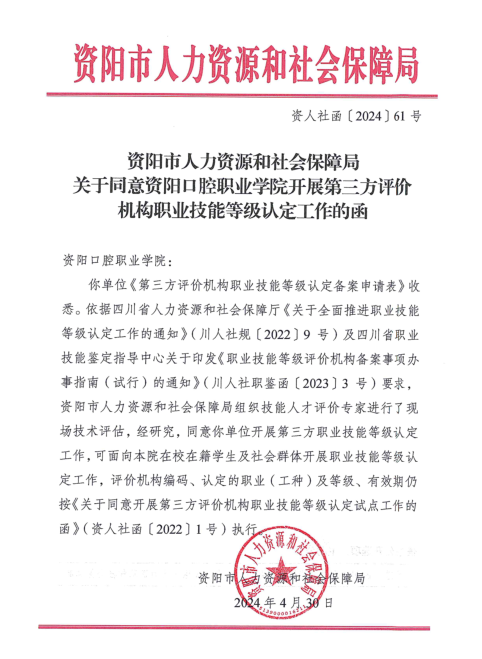 為響應(yīng)國家職業(yè)資格證書制度改革,資陽口腔職業(yè)學(xué)院緊抓國家職業(yè)技能等級認定試點的有利契機,于近日獲資陽市人力資源和社會保障局正式批復(fù),獲準(zhǔn)第三方評價機構(gòu)資質(zhì),可面向社會群體開展職業(yè)技能等級認定工作。