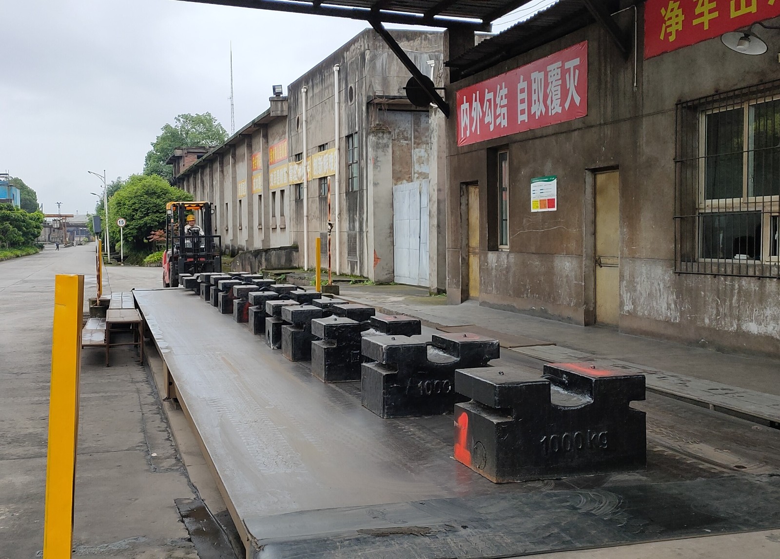 為確保本次檢定工作如期進(jìn)行,公司提前多次與屬地管理部門(mén)溝通,在峨眉山市市場(chǎng)監(jiān)督管理局的大力支持協(xié)調(diào)下,調(diào)用了峨勝水泥集團(tuán)股份有限公司的12只1000kg級(jí)的標(biāo)準(zhǔn)大砝碼用于本次檢定;相較于采用峨眉山市市場(chǎng)監(jiān)督管理局配置的20kg級(jí)標(biāo)準(zhǔn)小砝碼進(jìn)行檢定,有效減少了檢定過(guò)程用時(shí)10小時(shí)以上。同時(shí),為提高本次檢定過(guò)程的工作效率、檢定準(zhǔn)確度,以及將影響當(dāng)天進(jìn)出公司車輛的檢斤時(shí)間壓縮到最短創(chuàng)造了條件,減少了人力、物力資源浪費(fèi)。