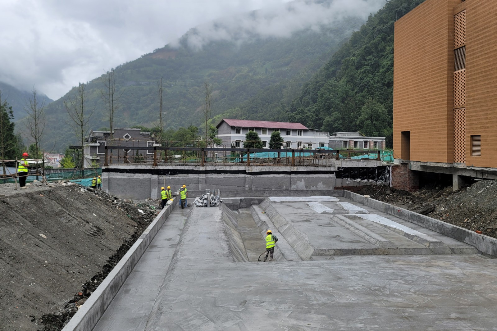 草科溫泉特色小鎮(zhèn)一期項(xiàng)目計(jì)劃總投資3.45億元,目前已實(shí)現(xiàn)投資約2.1億元,共投入建設(shè)人力1000余人,各類機(jī)械150余臺(tái)。截至6月30日,項(xiàng)目一期土建(含一次機(jī)電)工程已完成竣工預(yù)驗(yàn)收,災(zāi)后重建排水溝項(xiàng)目、中庭臺(tái)地花園喬木栽植已全部完成,總平景觀施工初步形成整體輪廓,室內(nèi)裝修基層施工、管網(wǎng)安裝等即將告捷。