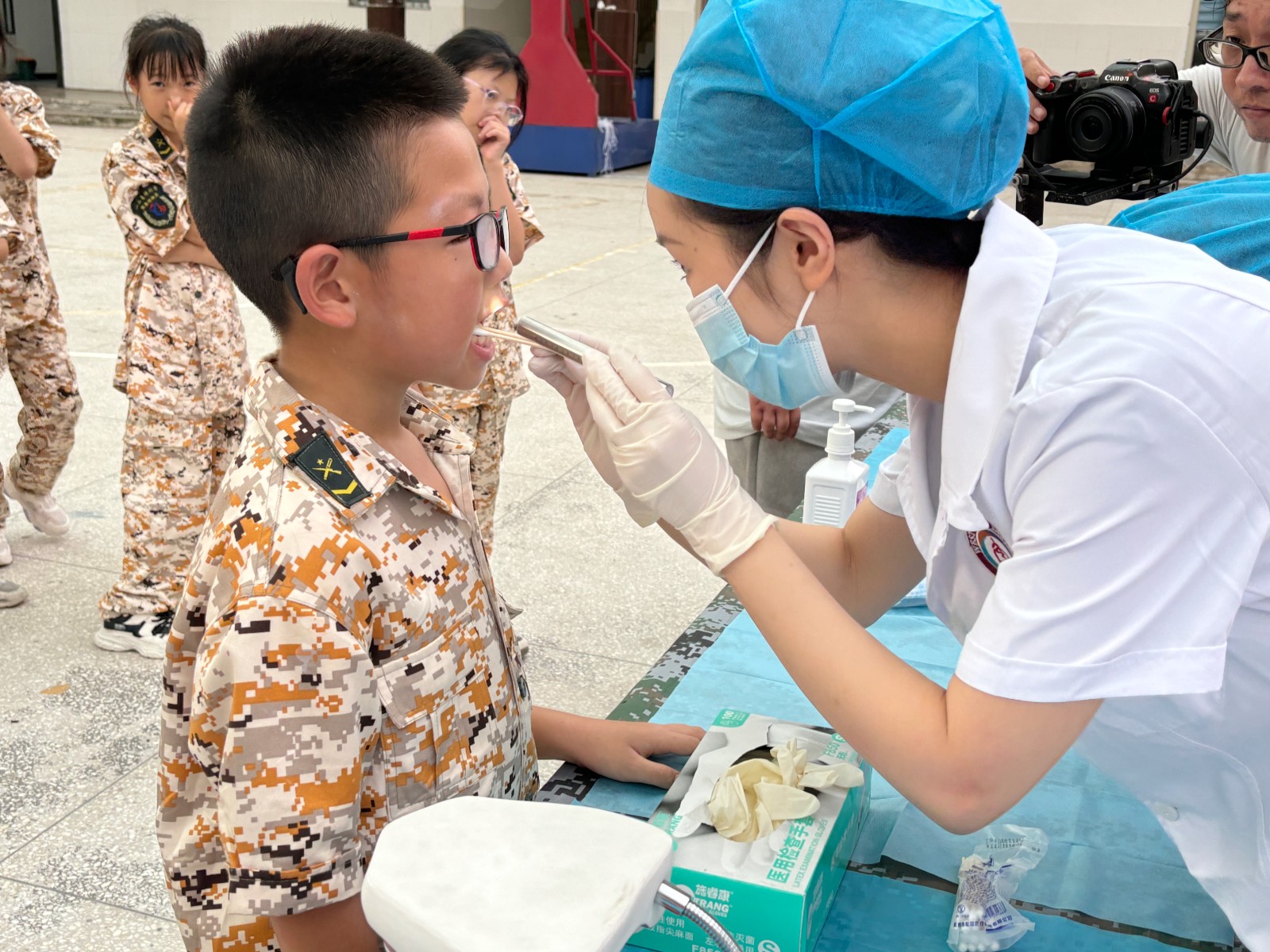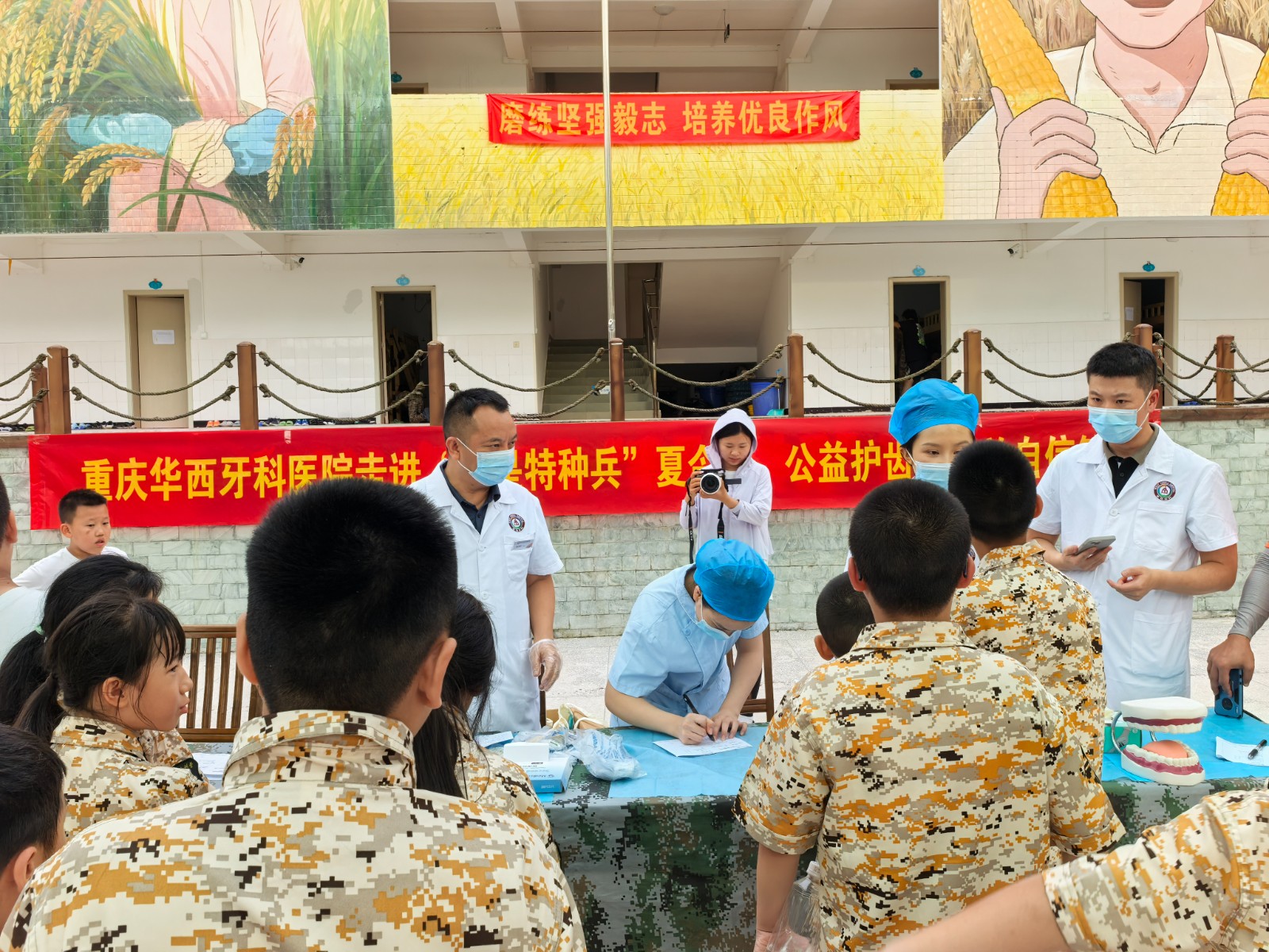 7月18日,重慶華西牙科醫(yī)院愛(ài)牙公益行走進(jìn)“我是特種兵”夏令營(yíng),為營(yíng)區(qū)內(nèi)的120名孩子免費(fèi)檢查口腔健康情況。