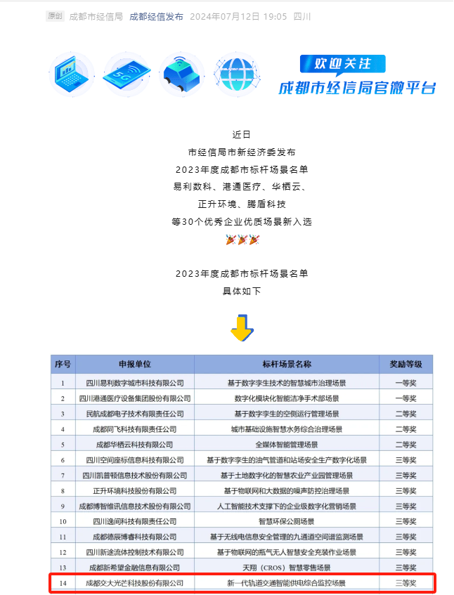近日,成都市經(jīng)信局市新經(jīng)濟(jì)委發(fā)布了2023年度成都市標(biāo)桿場(chǎng)景名單,交大光芒新一代軌道交通智能供電綜合監(jiān)控場(chǎng)景榮獲三等獎(jiǎng)。