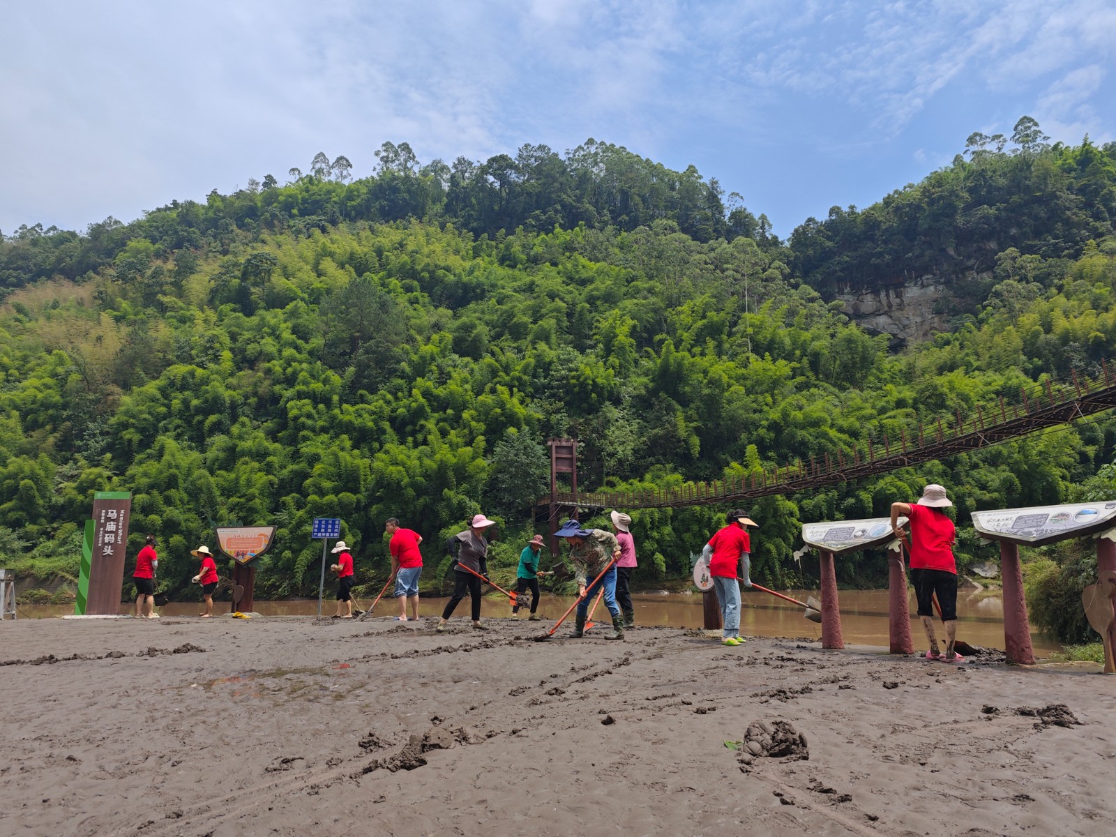 7月25日,馬邊河水逐漸退去,黨員、職工立即行動起來,頂著炎炎烈日、冒著高溫酷暑,黨員、職工們一邊用水沖,一邊用鏟刮,相互配合協(xié)同作戰(zhàn),衣服干了又濕濕了又干,卻沒有一個人叫苦叫累,經(jīng)過一整天的努力,終于在下午4點將所有淤泥全部清理干凈,泥濘的馬廟碼頭恢復(fù)往日的美麗、祥和,以嶄新姿態(tài)迎接游客們的到來。