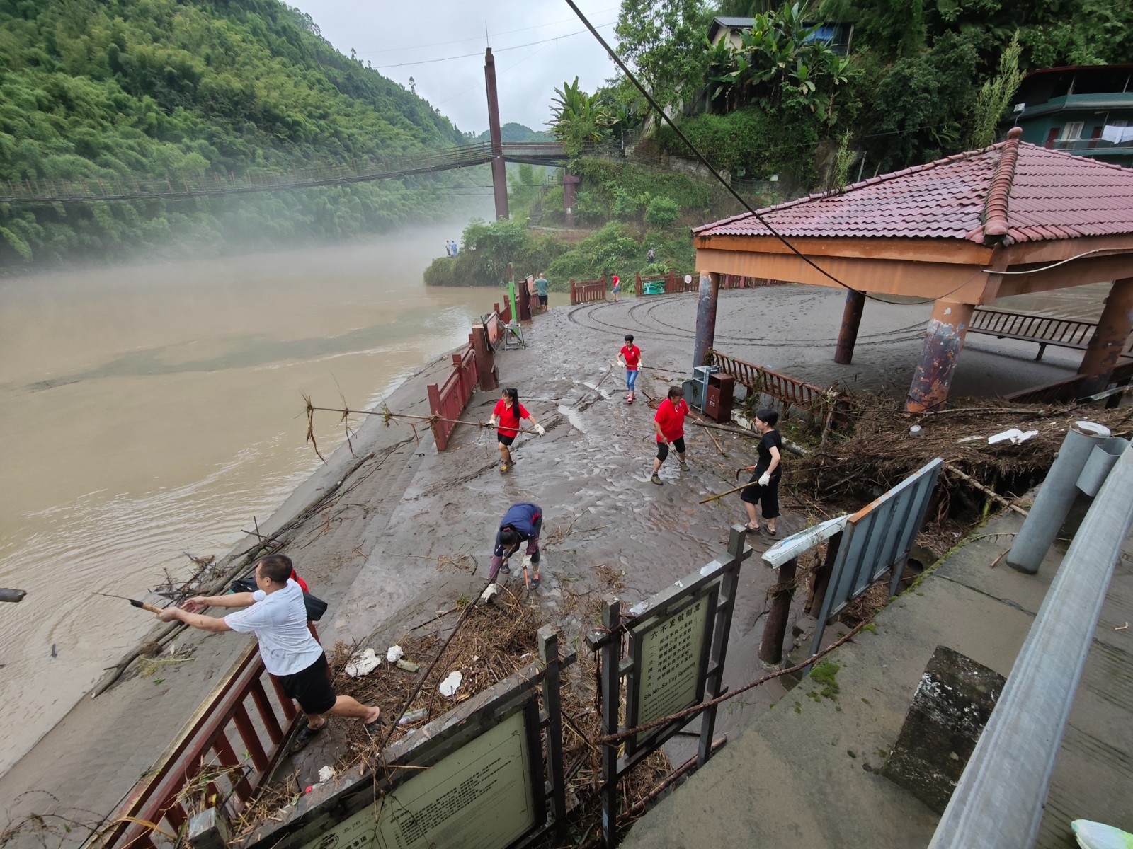 7月24日下午,犍為地區(qū)突降暴雨,馬邊河水暴漲,馬廟碼頭被淹沒,淤泥堆積近30公分厚,一片狼藉,對桫欏湖游船、侏羅紀(jì)探險谷接待游客造成嚴(yán)重影響。險情就是命令,川投峨旅公司芭溝桫欏湖管理部黨支部組織黨員、職工26人開展清理淤泥工作。