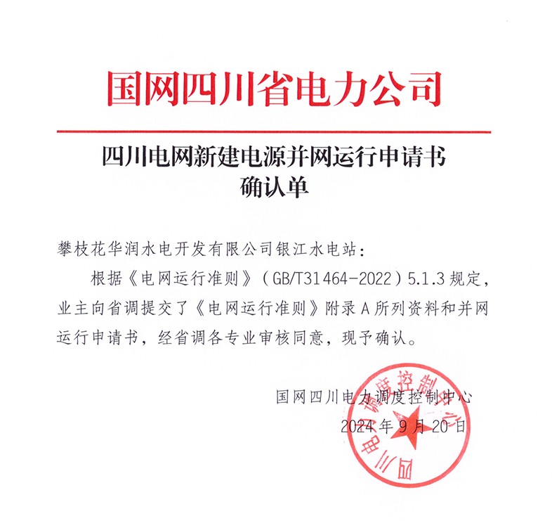 9月20日,在國(guó)網(wǎng)四川省電力公司和川投能源的指導(dǎo)幫助下,經(jīng)過(guò)積極對(duì)接、多方協(xié)調(diào),川投能源下屬攀水電公司成功取得銀江水電站新建電源并網(wǎng)運(yùn)行申請(qǐng)書確認(rèn)單,標(biāo)志著銀江水電站具備并網(wǎng)手續(xù)辦理的資格條件。