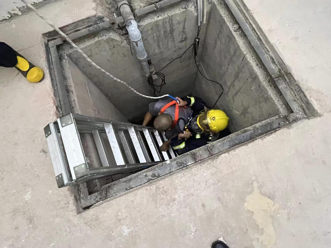 本次演練共分為檢測組、現(xiàn)場作業(yè)組、應(yīng)急救援組、治安維護(hù)組、醫(yī)療救護(hù)組五組人員。演練模擬一名維修人員,為檢查污水井水泵故障情況,在未佩戴防毒面具的情況下,下至集水坑底部,導(dǎo)致吸入過量有害氣體,昏倒在坑底,急需救援?,F(xiàn)場作業(yè)組立即將事故情況上報(bào),啟動(dòng)預(yù)案開展應(yīng)急救援。