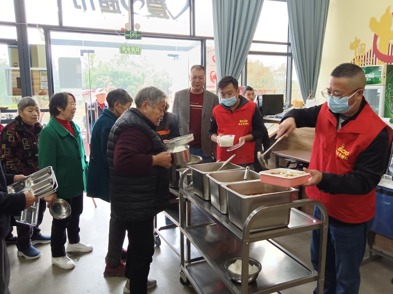 井然有序的活動現(xiàn)場,身著醒目紅色馬甲的黨員們迅速分工、密切合作,有的拿起掃帚、拖把和抹布開展衛(wèi)生清潔,從地面到墻面、從桌椅到餐具的每一個角落,為老人們營造整潔舒適的就餐環(huán)境;有的為行動不便的老年人及時送餐上門,讓他們能心情愉悅地享用美食;有的則陪伴在老人身邊與他們親切交談,關(guān)愛他們的健康與需求,傾聽他們的心聲與故事。“爸媽食堂”內(nèi)忙碌穿梭的黨員身影,構(gòu)成了一幅幅溫馨動人的畫面。