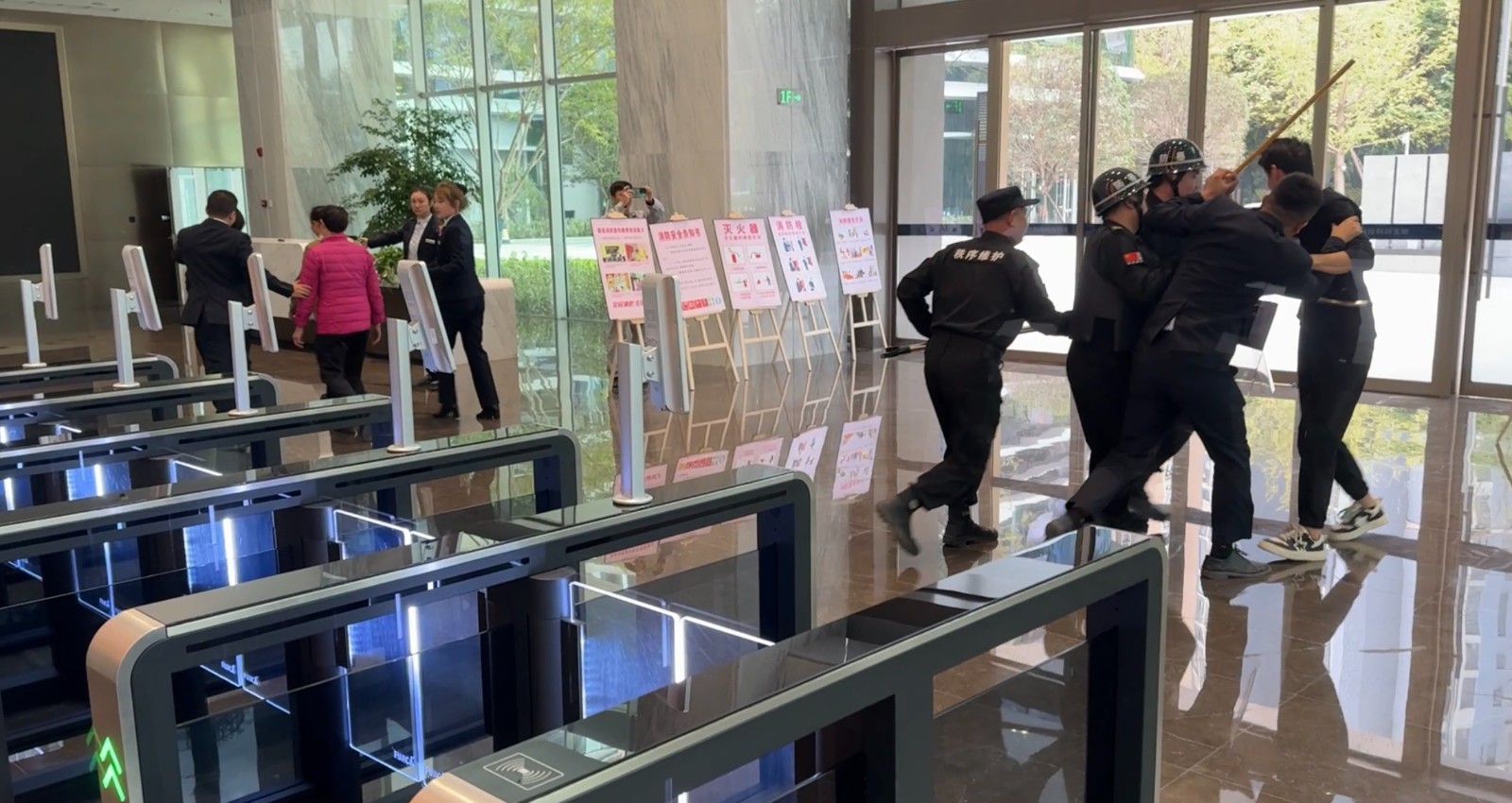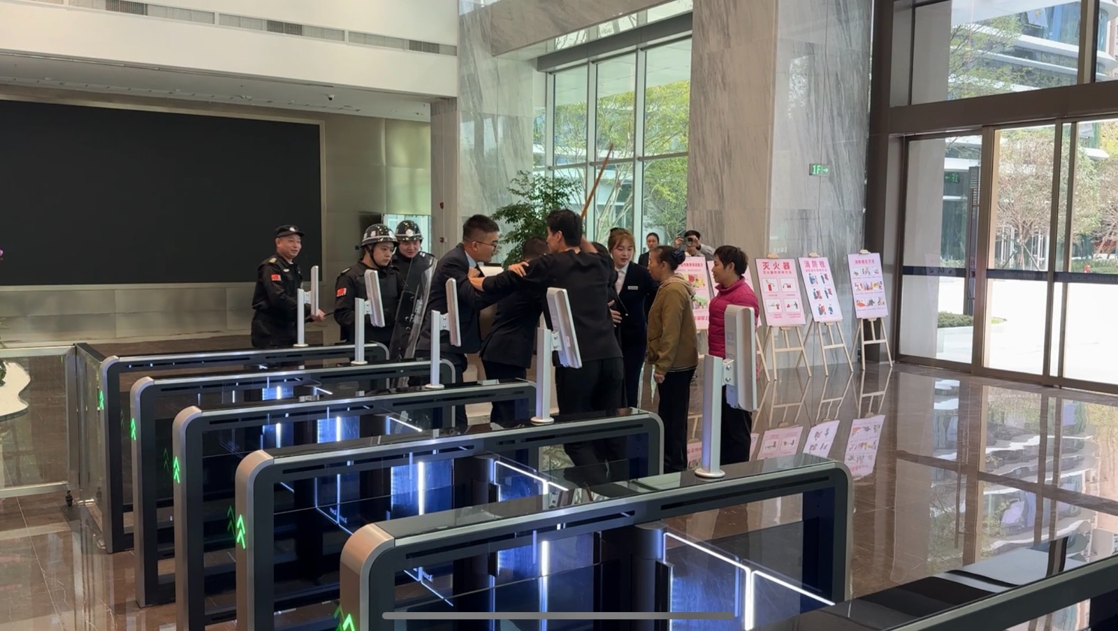 演練模擬了四名手持棍棒的“不法分子”強行闖入大廈的場景。前臺人員在第一時間發(fā)現異常并迅速通知現場安防人員,安防人員立即采取緊急措施。他們手持防暴器械,勇敢地阻止了“不法分子”的行動,迅速集結并展現出了卓越的團隊協作能力。在短短兩分鐘內,成功將“歹徒”制服,展現了全體員工高效的應對能力。