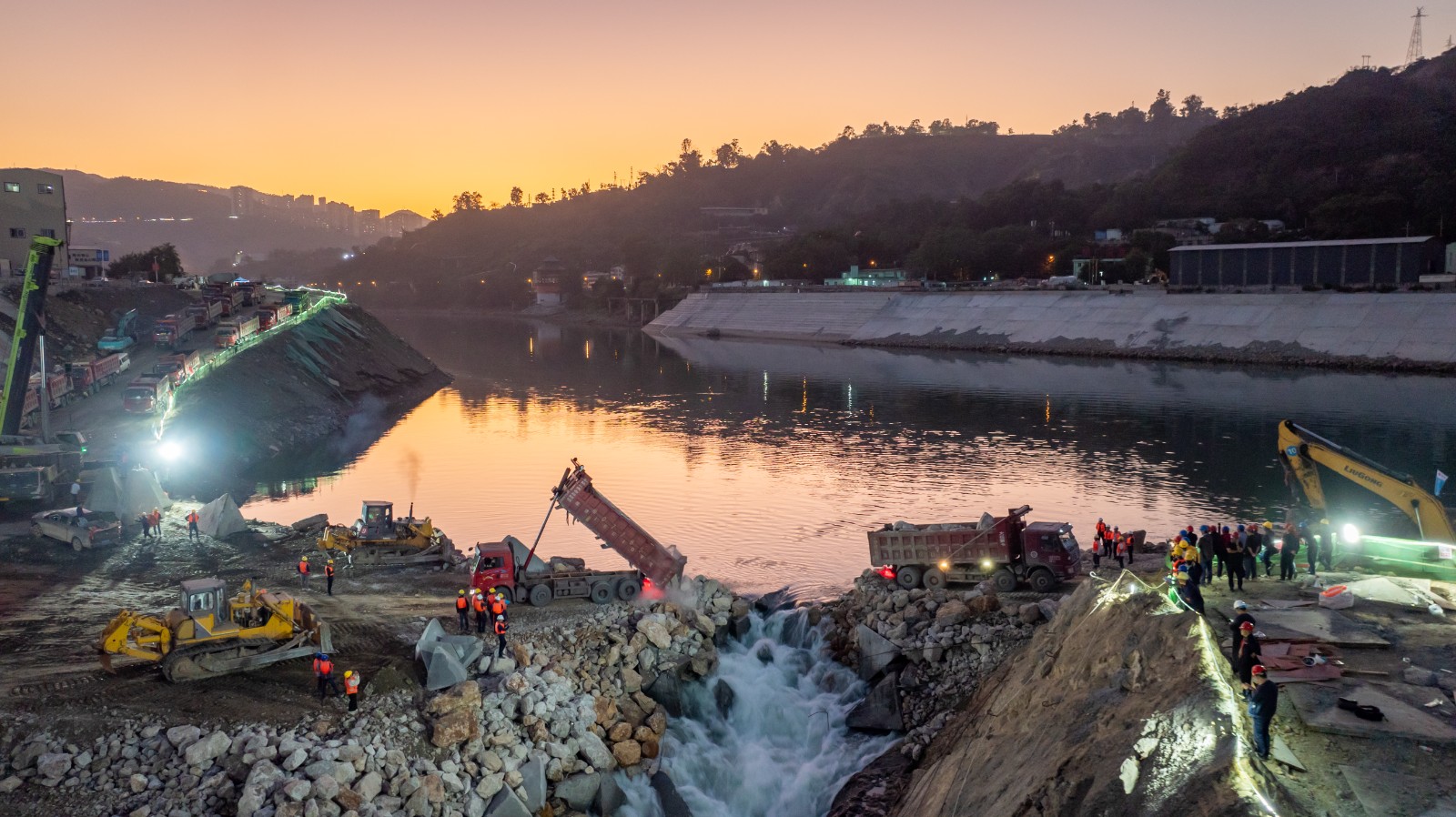 這一里程碑節(jié)點來之不易。經(jīng)測算,導(dǎo)流明渠截流期間流速超過5米每秒,截流戧堤部位水深達(dá)到14米,上游來水在1000立方米每秒以內(nèi)時,主河床攔沙坎范圍基本不過流,同時下游尾水受雅礱江回水頂托影響,導(dǎo)致溢流壩閘孔在小流量情況下分流效果差,截流難度非常大。針對此情況,川投能源攀水電公司組建導(dǎo)流明渠截流指揮部,主要領(lǐng)導(dǎo)帶隊進(jìn)行24小時輪流巡查,全面指導(dǎo)現(xiàn)場截流工作。為確保施工安全可控,川投能源攀水電公司聯(lián)合主要參建單位對資源投入、特殊截流材料準(zhǔn)備、填筑強度等情況進(jìn)行分析總結(jié),協(xié)調(diào)解決現(xiàn)場問題和上游三級水電站、各級調(diào)度中心控制下泄流量,盡力減小截流難度。現(xiàn)場還準(zhǔn)備了大體積混凝土四面體、合金網(wǎng)兜、鋼筋石籠、塊石串等特殊截流材料近3000個,在龍洞料場轉(zhuǎn)運石料近3萬余噸,確保導(dǎo)流明渠順利截流。