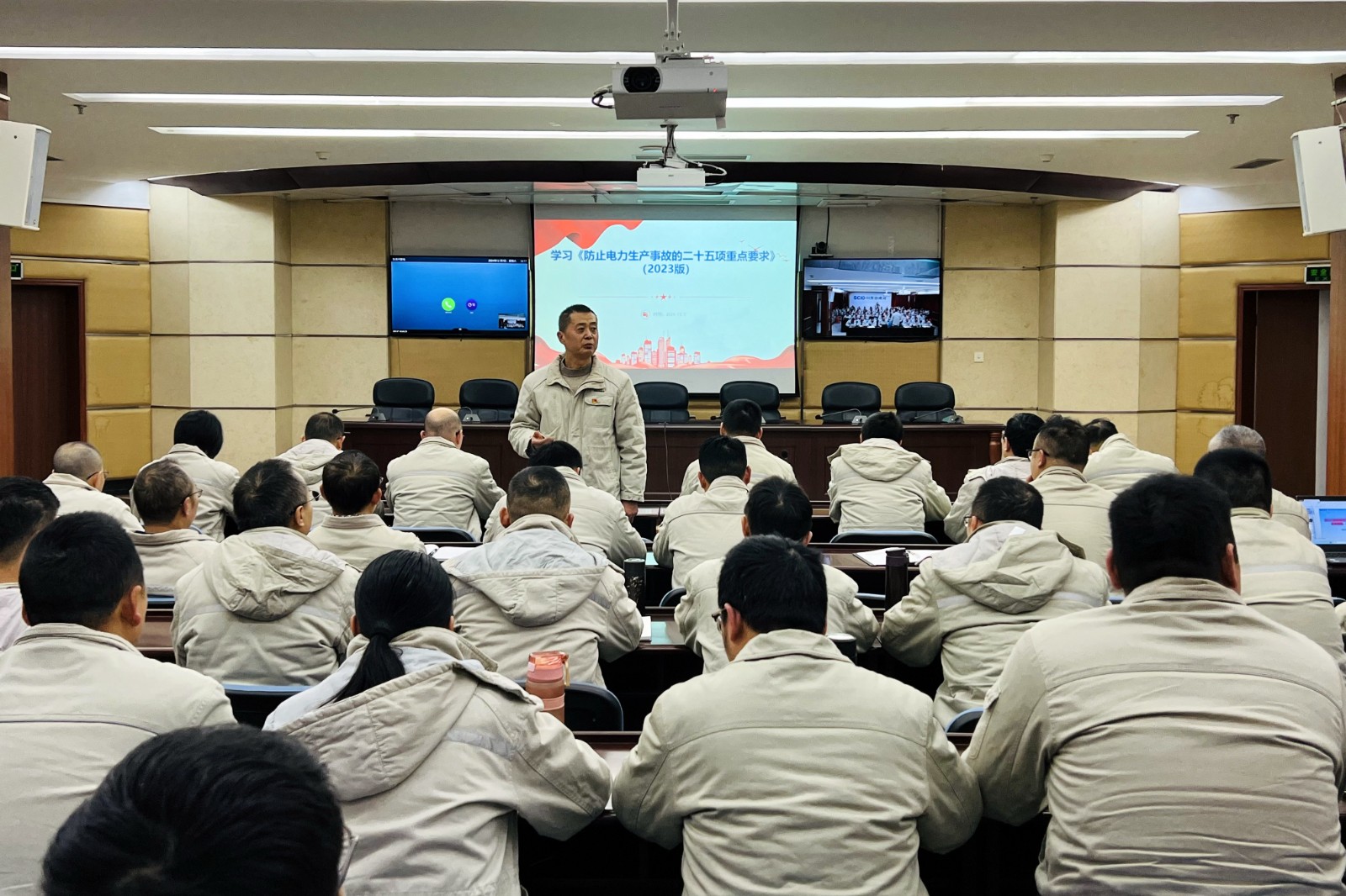 為有效提升員工應(yīng)急處置能力,提高公司電力安全生產(chǎn)管理水平,12月7日,川投田灣河公司組織召開專題培訓(xùn)會(huì),圍繞《防止電力生產(chǎn)事故的二十五項(xiàng)重點(diǎn)要求(2023版)》(以下簡稱“二十五項(xiàng)重點(diǎn)要求”)和公司應(yīng)急預(yù)案、應(yīng)急知識(shí)進(jìn)行學(xué)習(xí)培訓(xùn)。會(huì)議由公司黨委副書記、總經(jīng)理、安環(huán)職委會(huì)主任楊超龍主持,生產(chǎn)部門全體員工參加培訓(xùn)。