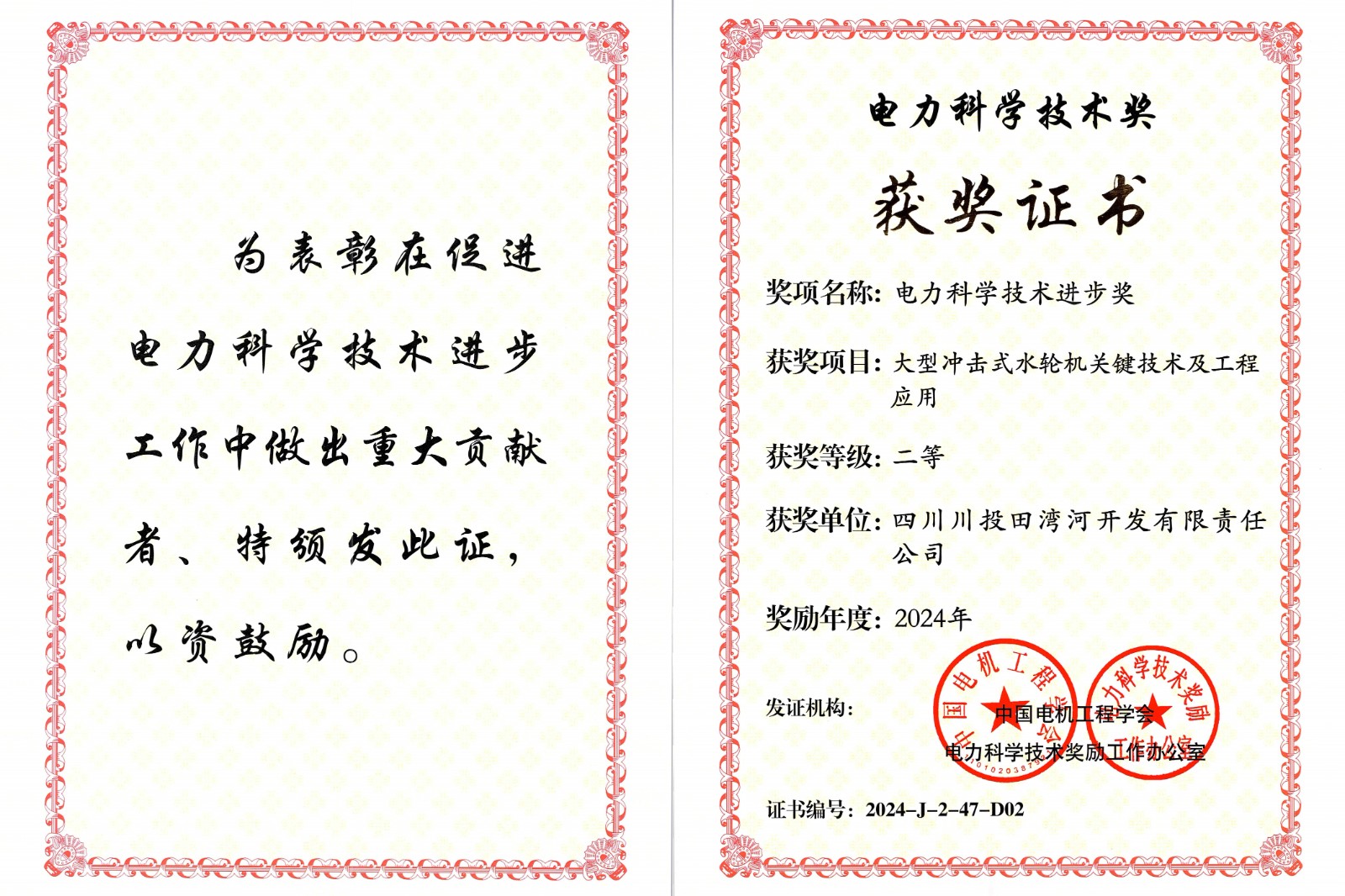 近日,川投田灣河公司與東方電氣集團(tuán)東方電機(jī)有限公司聯(lián)合研究的金窩電站《大型沖擊式水輪機(jī)關(guān)鍵技術(shù)應(yīng)用》獲得中國(guó)電機(jī)工程學(xué)會(huì)電力科學(xué)技術(shù)獎(jiǎng)進(jìn)步獎(jiǎng)“二等獎(jiǎng)”。