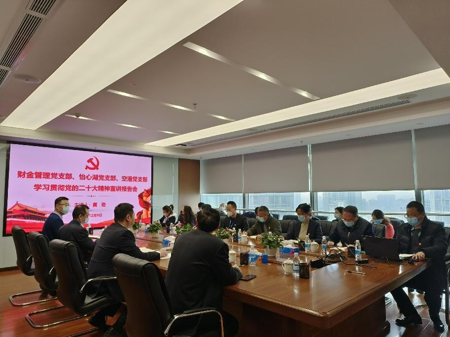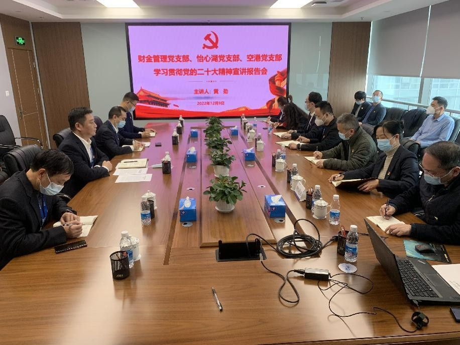 12月9日,為深入學(xué)習(xí)宣傳貫徹黨的二十大精神,集團(tuán)公司財務(wù)總監(jiān)黃勁赴財金管理黨支部、怡心湖黨支部和空港黨支部宣講黨的二十大精神;會議由怡心湖黨支部書記龔帝偉主持。
